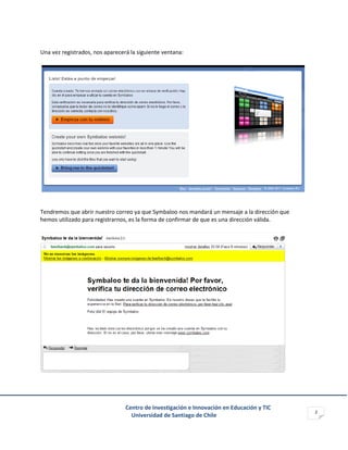 Este documento explica cómo usar Symbaloo, un programa que permite organizar sitios web favoritos en una sola página de inicio. Primero se registra una cuenta en Symbaloo. Luego, se pueden añadir bloques de sitios web y servicios a la página de inicio personalizada llamada escritorio. Finalmente, el documento indica cómo crear bloques personalizados y escritorios propios para organizar los recursos web de acuerdo a diferentes temas.