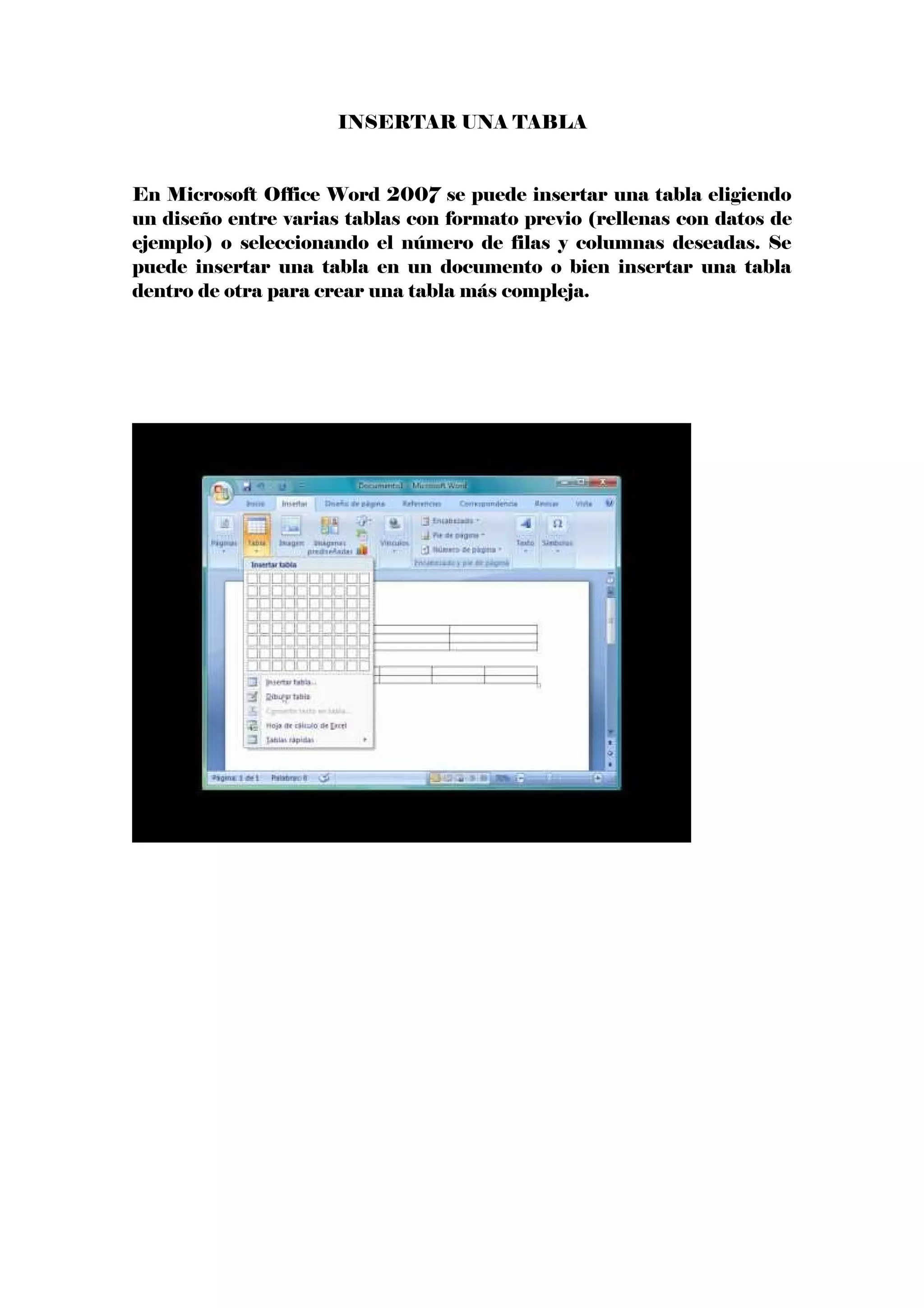 Este documento proporciona instrucciones para insertar tablas en Microsoft Word de varias maneras: seleccionando una plantilla de tabla rápida, especificando el número de filas y columnas, combinando celdas, dibujando una tabla compleja manualmente o utilizando el comando Insertar tabla para aplicar formato. Explica cómo crear y editar tablas flexibles mediante estas diversas herramientas.