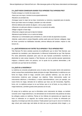 Este documento proporciona instrucciones para usar un programa de telehipnosis y telehipnosis pro, incluyendo requisitos técnicos, descripción de las funciones del programa, y pasos para instalar y usar el programa como obtener una fotografía de la persona, grabar un mensaje de audio, y obtener el índice radiónico.