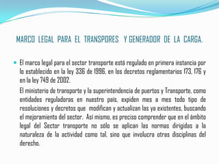 El documento resume el marco legal para el transporte y generación de carga en Colombia. Describe las leyes y decretos que regulan el sector, así como las entidades reguladoras. Explica que el derecho penal, administrativo, civil y comercial son aplicables, dependiendo del tipo de infracción. También presenta los procedimientos e implicados en el transporte de carga, incluyendo documentación, seguros y responsabilidades.