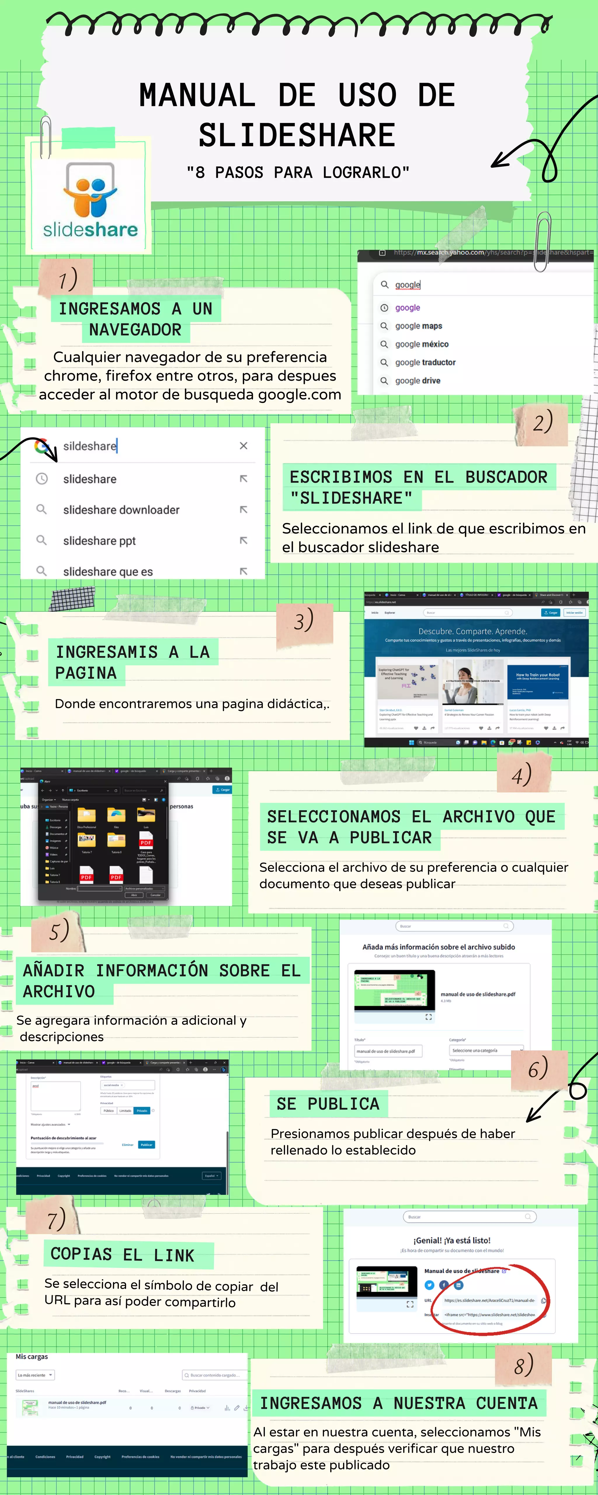 Este documento describe 8 pasos para publicar un archivo en SlideShare: 1) ingresar a un navegador web como Chrome o Firefox, 2) buscar "SlideShare" en Google, 3) seleccionar el enlace de SlideShare, 4) seleccionar el archivo a publicar, 5) completar la información requerida, 6) publicar el archivo, 7) verificar que se haya publicado en la cuenta de usuario, 8) copiar el enlace URL para compartirlo.