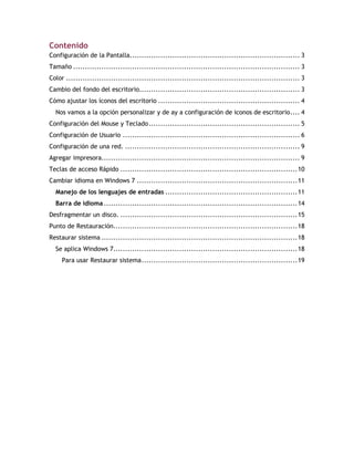 El documento es un manual de usuario sobre la configuración y personalización de Windows 7, abarcando aspectos como la configuración de pantalla, ajustes de íconos, configuración de mouse y teclado, y cómo gestionar cuentas de usuario y redes. También incluye instrucciones para cambiar el idioma, agregar impresoras y utilizar herramientas como la restauración del sistema y la desfragmentación de discos. Está dirigido a estudiantes de tecnología de la información en la Universidad Tecnológica del Estado de Zacatecas.