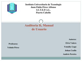 Este documento describe el manual de usuario de un sistema de registro para el Auditorio II del Instituto Universitario de Tecnología Juan Pablo Pérez Alfonso. El sistema permite registrar conciertos, temporadas, intérpretes, músicos individuales, grupos, orquestas, piezas musicales y entradas. Cada pantalla del sistema permite registrar y visualizar la información de una de estas categorías y contiene enlaces para navegar entre pantallas.