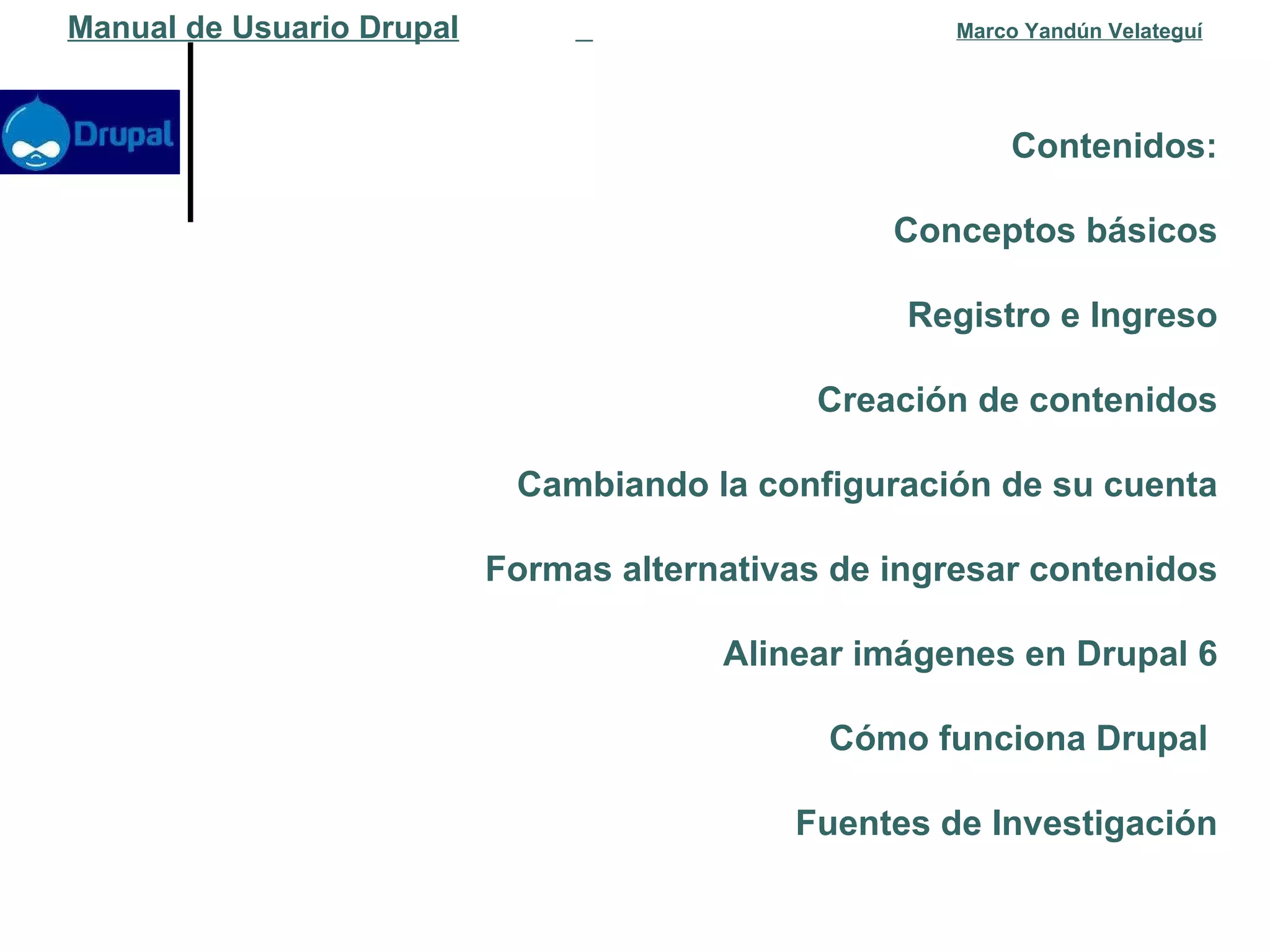 Este documento proporciona una introducción a Drupal, un sistema de administración de contenido. Explica conceptos básicos como registro de usuarios, creación y organización de contenido en diferentes tipos de nodos, y permiso de acceso. También describe brevemente cómo preparar contenido fuera de línea y publicarlo en Drupal usando formularios.
