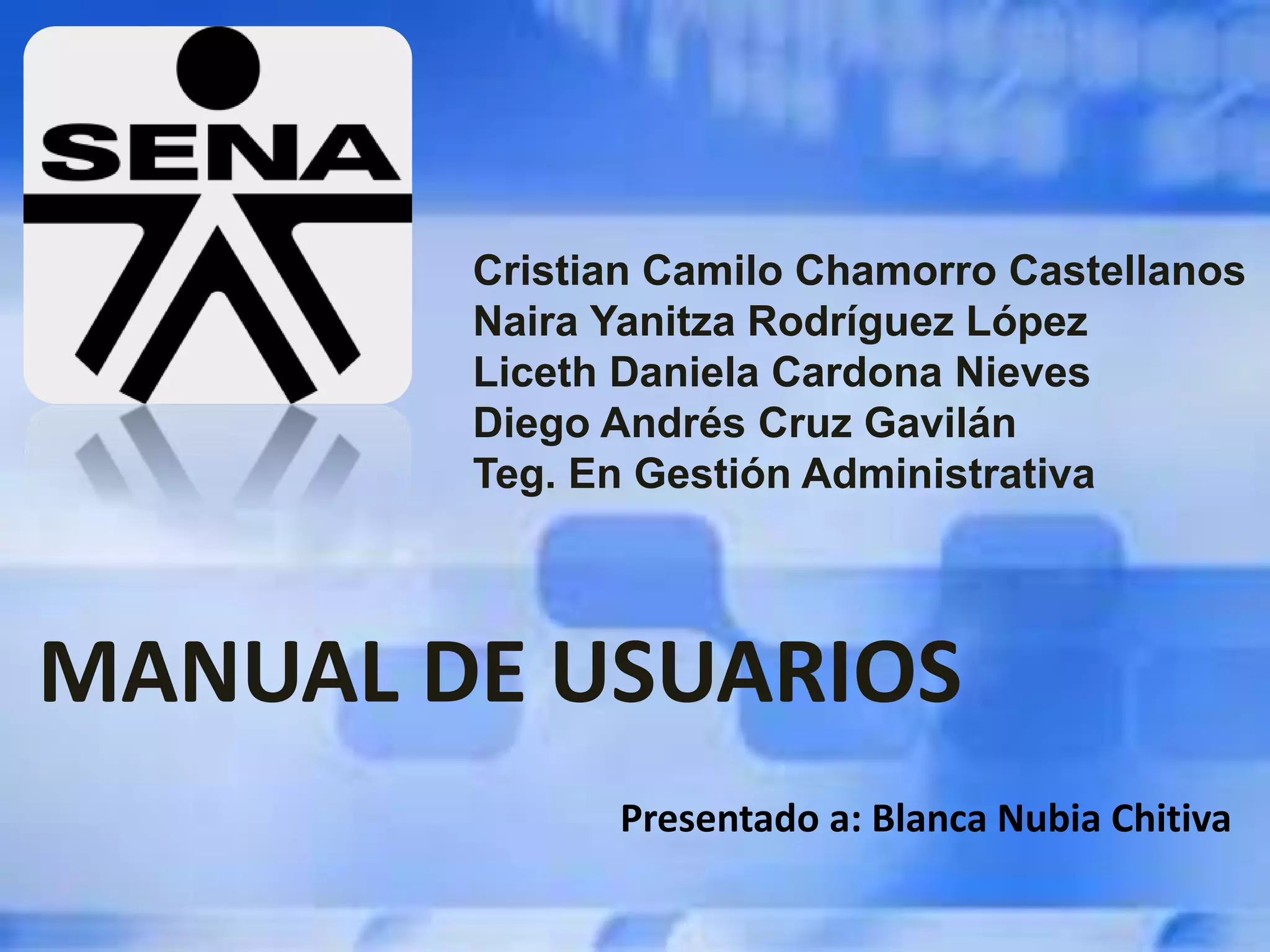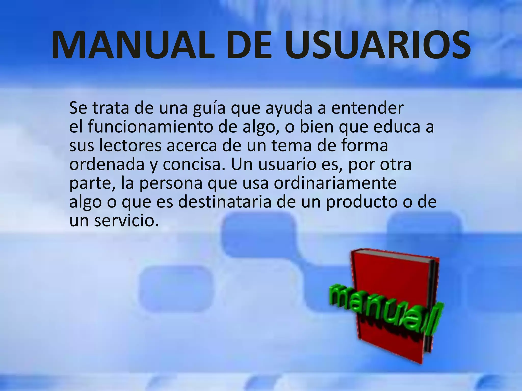 Este documento presenta una guía sobre los manuales de usuarios. Explica que un manual de usuario es una guía que educa a los lectores sobre cómo funciona y usar un producto de forma ordenada y concisa. Describe que los manuales suelen incluir textos, imágenes, diagramas y esquemas para facilitar la comprensión. También detalla las secciones comunes que contienen los manuales como introducción, índice, guía, solución de problemas y datos de contacto.