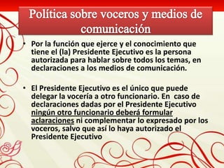 El documento proporciona lineamientos sobre comunicación para el manejo de crisis. Señala que el Presidente Ejecutivo es el único autorizado a hablar con los medios de comunicación sobre cualquier tema de la organización. También establece que los voceros son funcionarios designados para dar declaraciones a los medios, y deben ceñirse a los mensajes clave autorizados por el Presidente Ejecutivo. Además, ofrece recomendaciones para que los voceros se preparen y actúen de manera adecuada cuando interactúen con los medios de comunicación durante una crisis.