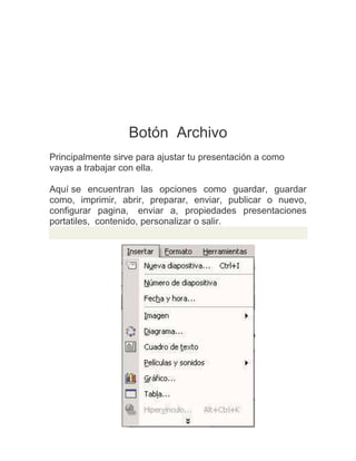 Este documento proporciona una descripción de los diferentes botones y menús de PowerPoint. En resumen: (1) El botón Archivo permite guardar, abrir y configurar presentaciones; (2) El botón Inicio permite editar diapositivas y agregar formato de texto; (3) El botón Insertar permite agregar tablas, imágenes y otros objetos a las diapositivas; y (4) Los botones Diseño, Transiciones, Animaciones y Presentación permiten personalizar