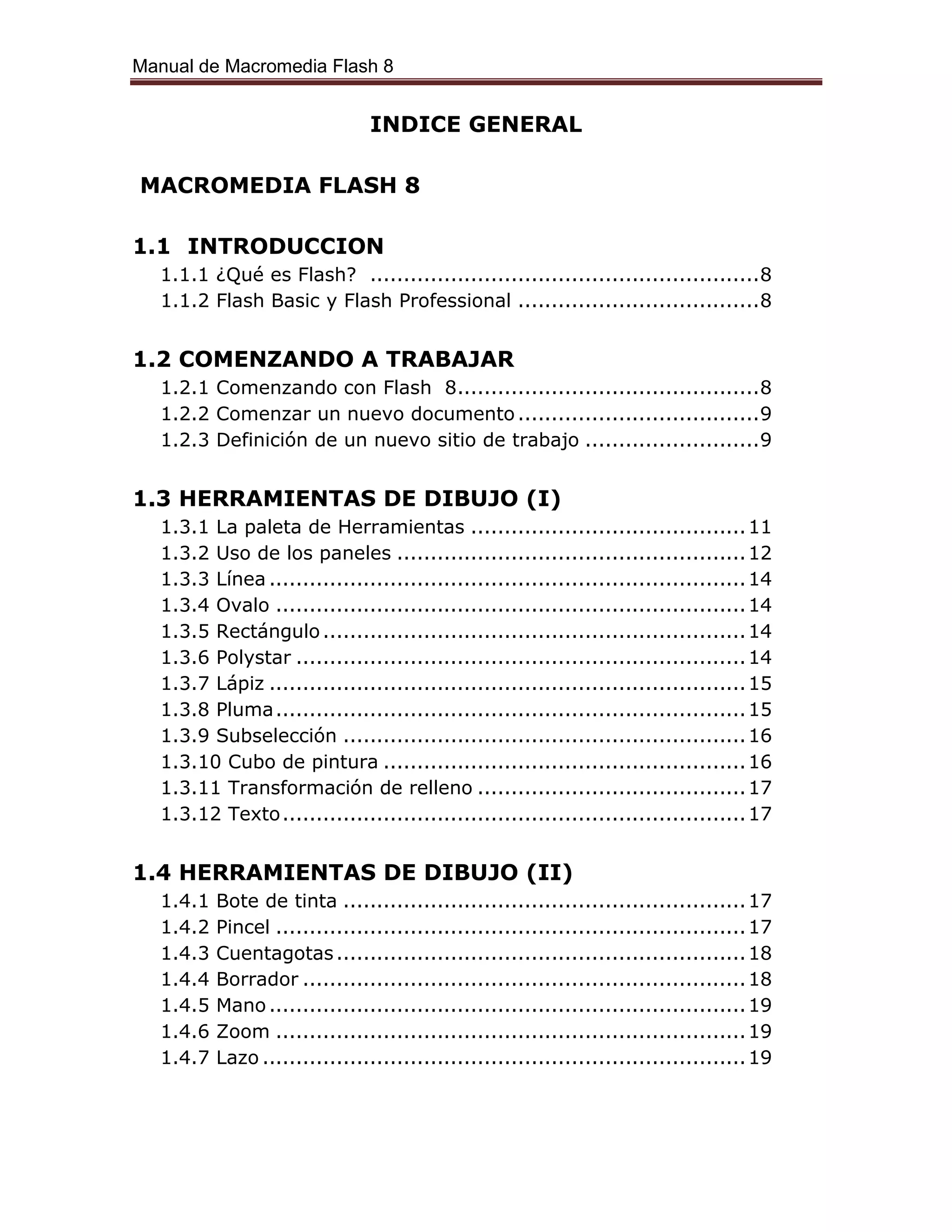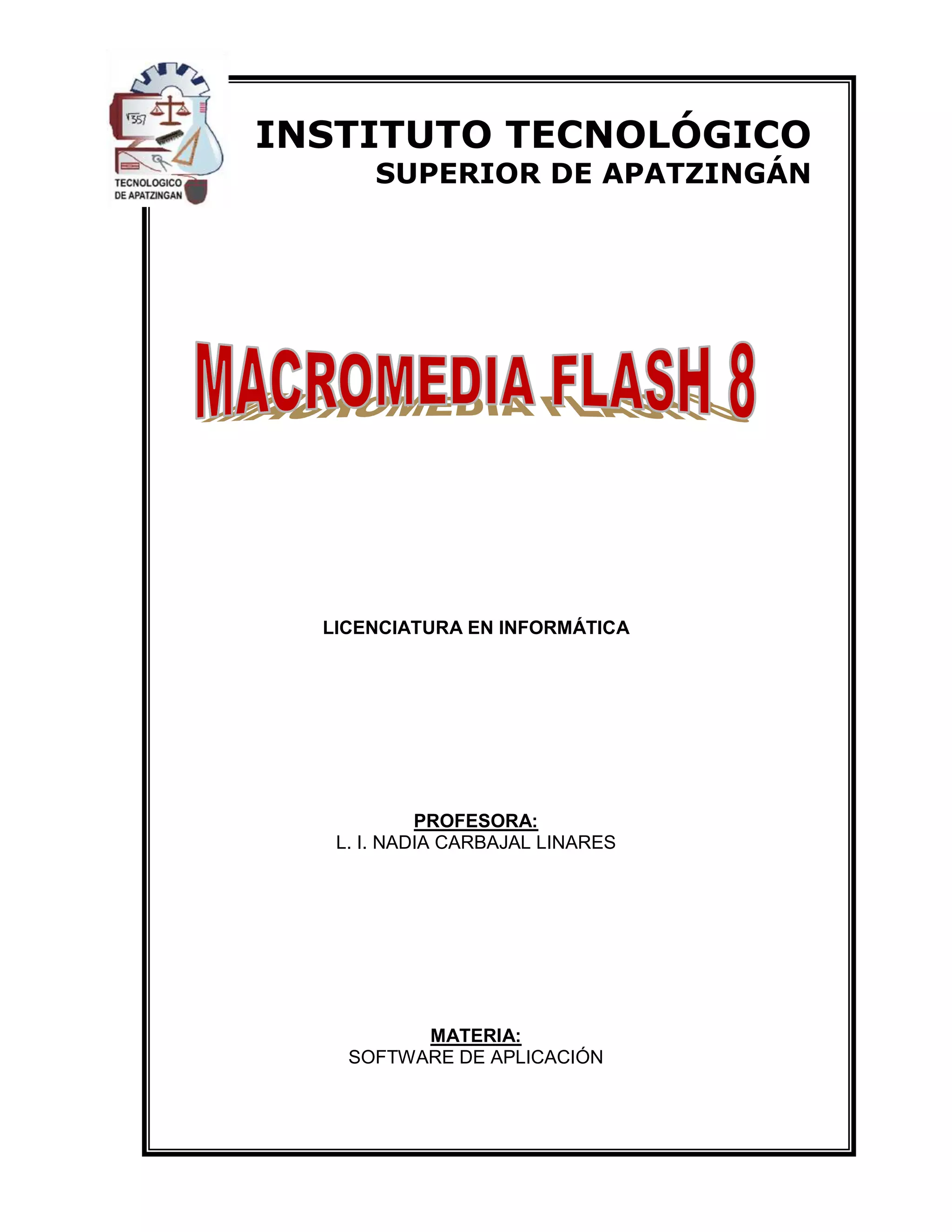 Este manual describe las herramientas y funciones de Macromedia Flash 8 para crear animaciones e interactividad. Explica cómo utilizar las herramientas de dibujo para crear y modificar objetos, aplicar colores y filtros, trabajar con capas, importar imágenes y sonido, y agregar acciones interactivas mediante ActionScript. También incluye prácticas paso a paso para aplicar estas funciones, como la creación de degradados, la animación por interpolación de movimiento, la inserción de botones interactivos y la publicación de documentos Flash.