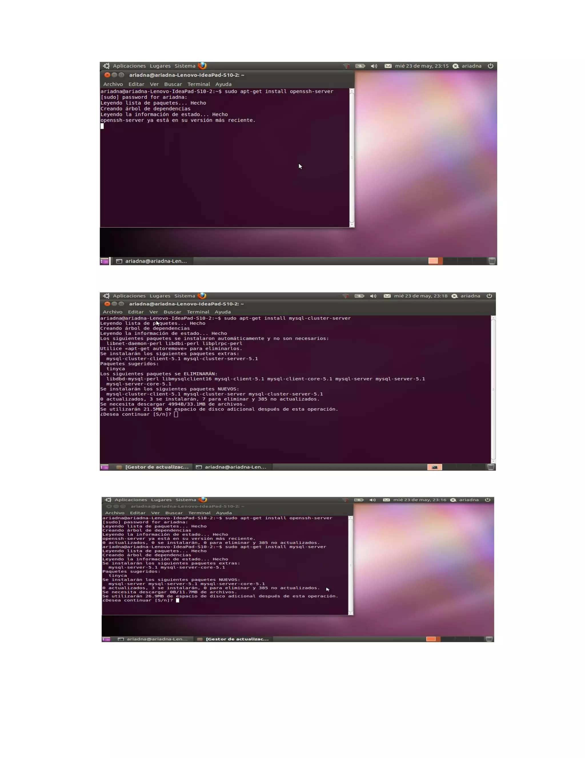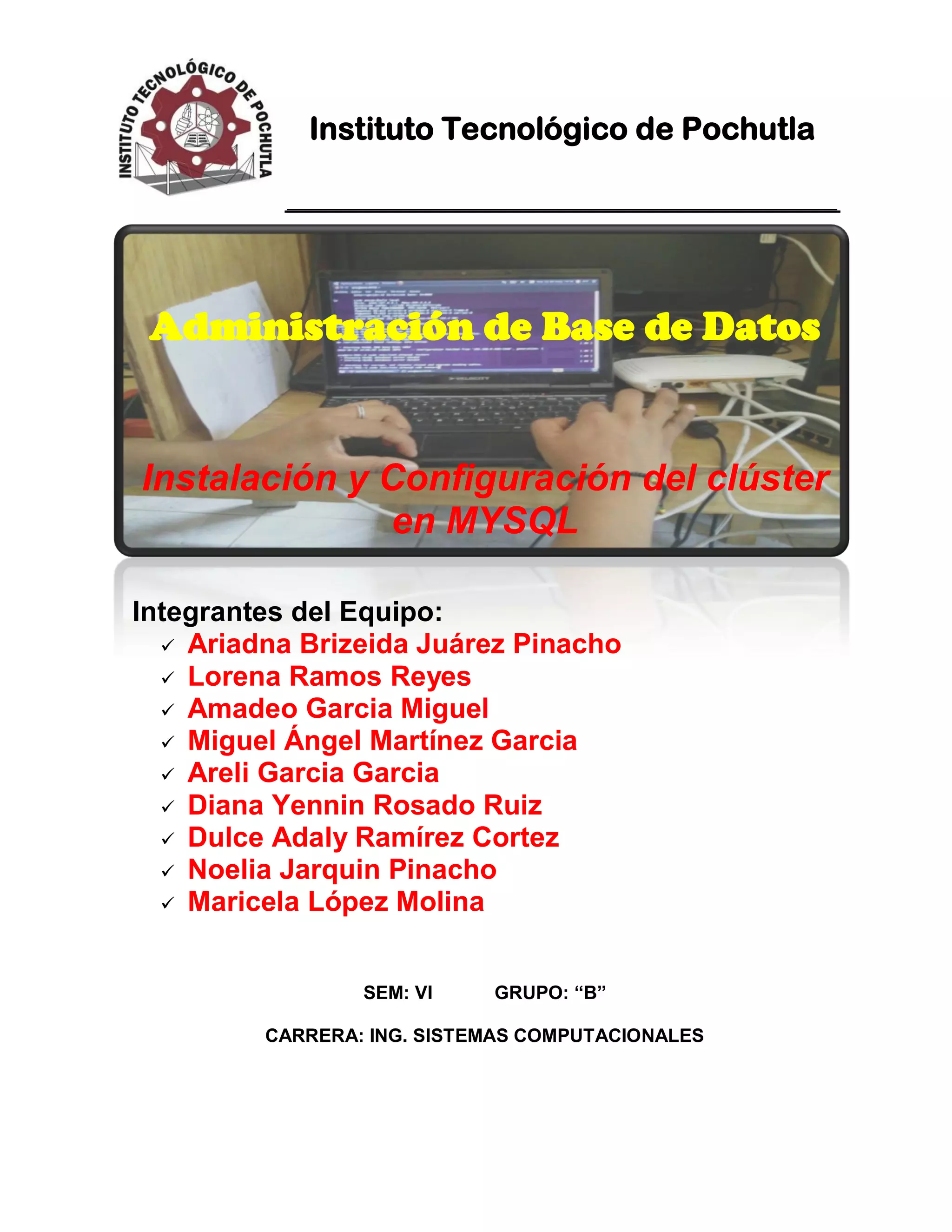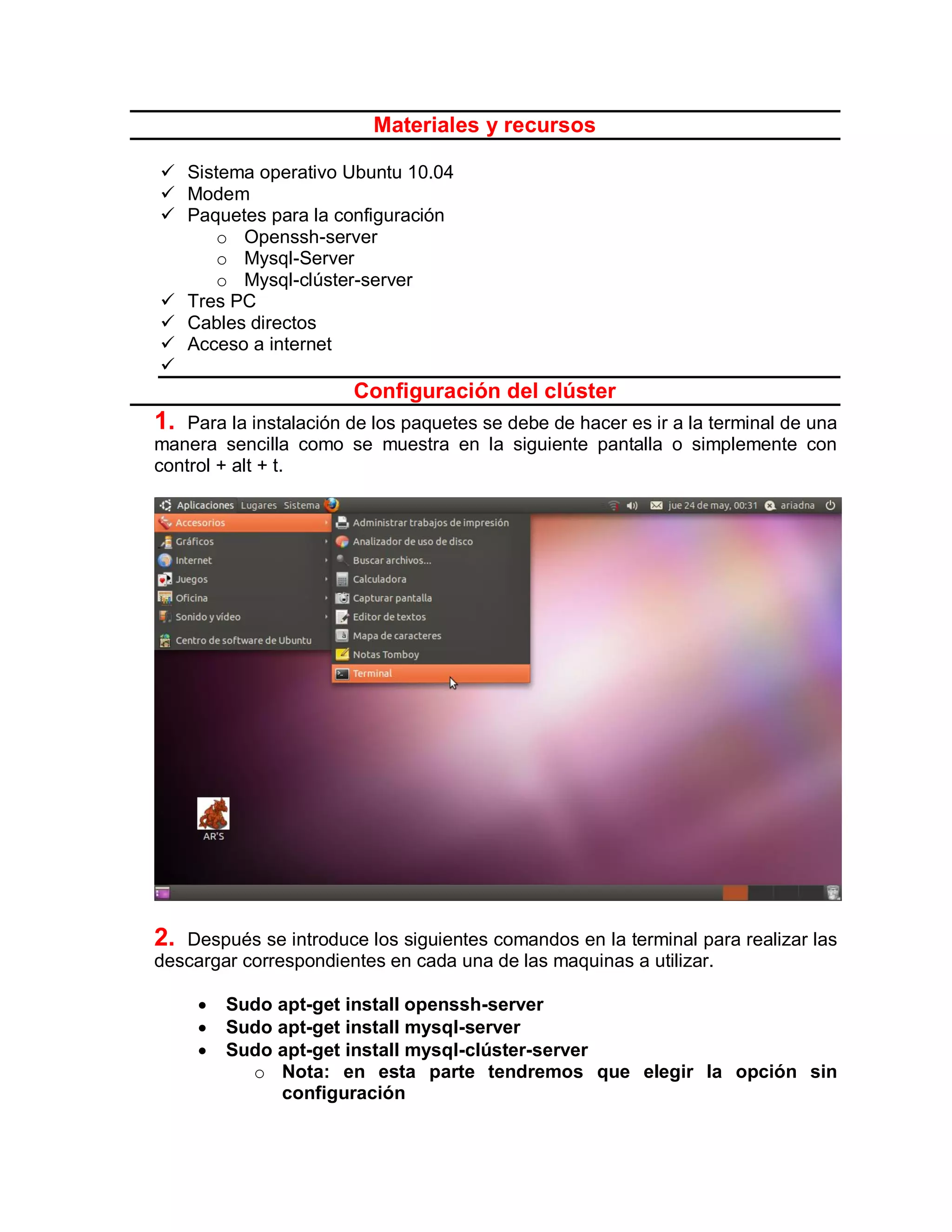 Este documento describe la instalación y configuración de un clúster de MYSQL en tres computadoras con Ubuntu 10.04. Explica los pasos para instalar los paquetes necesarios como openssh-server, mysql-server y mysql-cluster-server. Luego detalla la configuración del nodo administrador y los nodos de almacenamiento, incluyendo la asignación de IPs fijas y la edición de archivos de configuración. Finalmente, reinicia los demonios y verifica que el clúster funciona correctamente creando una base de datos y tabla en nodos diferentes.