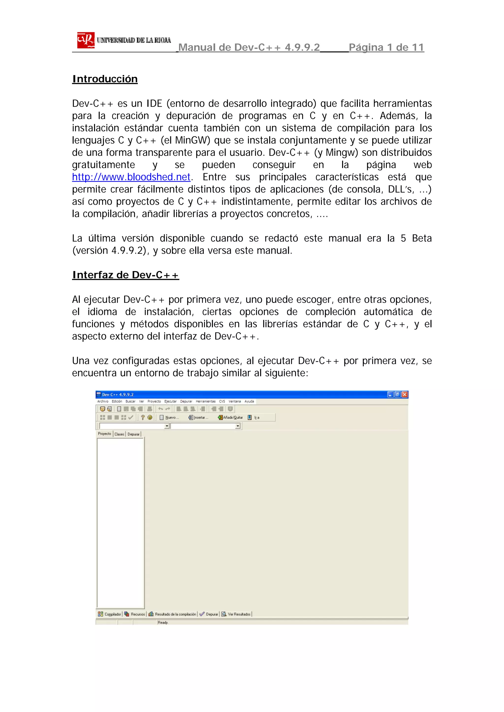 Este documento presenta una introducción al IDE Dev-C++. Explica que Dev-C++ permite crear y depurar programas en C y C++ en Windows. Describe la interfaz de Dev-C++, incluyendo el explorador de proyectos, el editor de código y la pestaña de resultados. También explica cómo crear y modificar proyectos, compilar programas y ejecutarlos.