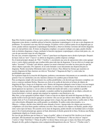 Este documento proporciona una introducción al programa Dia, que permite crear diferentes tipos de diagramas. Explica cómo crear un diagrama de flujo básico agregando cajas de decisión y texto y conectándolos con flechas. También describe cómo personalizar el diagrama cambiando el color del texto, agrupando objetos y agregando imágenes. El documento concluye que Dia es una herramienta útil para crear diagramas, aunque aún falta la capacidad de rotar objetos.
