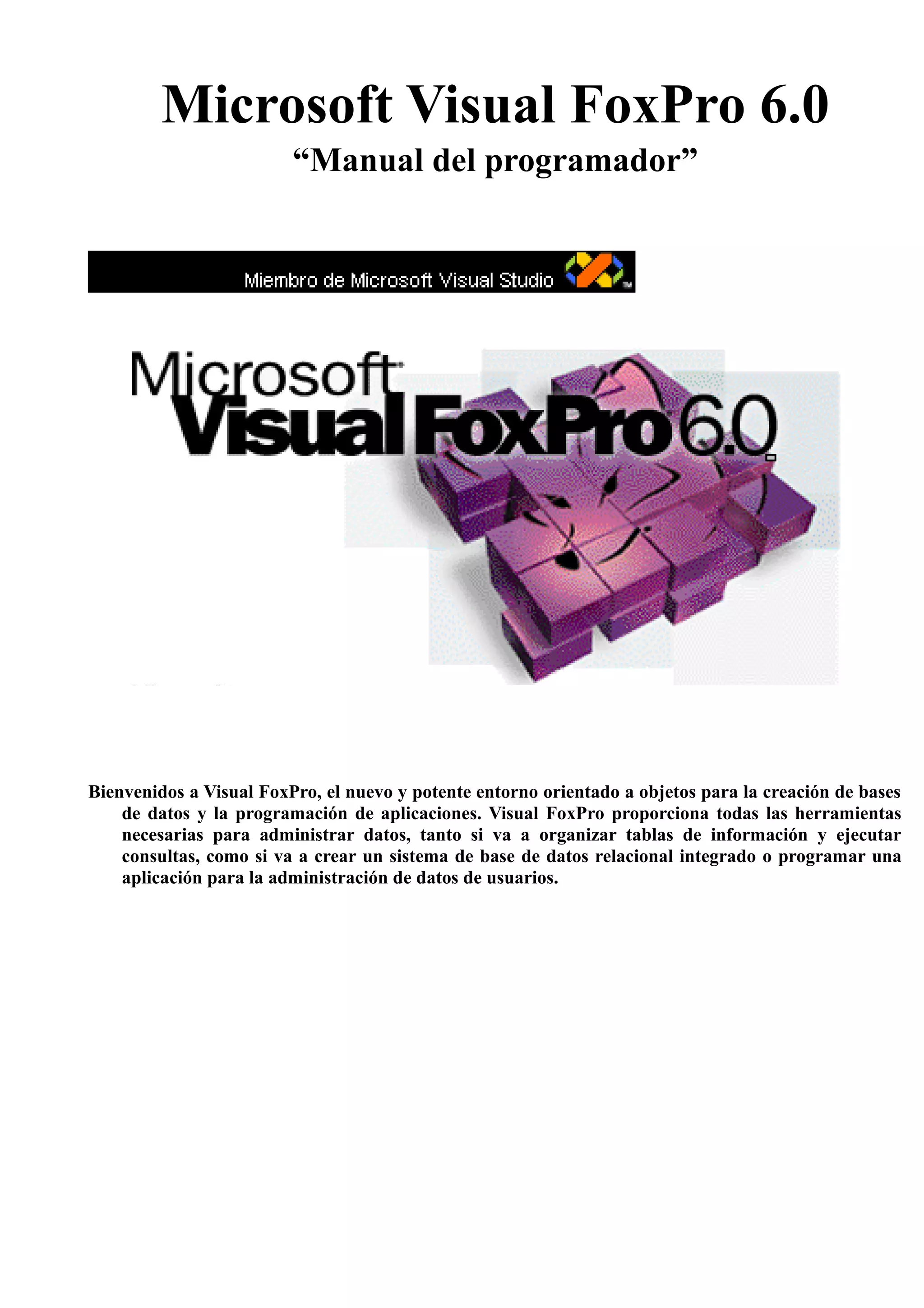 Este documento presenta Visual FoxPro 6.0 como un potente entorno de programación orientado a objetos para crear aplicaciones y bases de datos. Explica que la programación en Visual FoxPro combina programación por procedimientos y orientada a objetos para crear aplicaciones flexibles. Además, describe las ventajas de usar programas en lugar de comandos individuales, como la capacidad de modificar y reutilizar código de manera fácil.