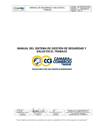 Este manual presenta los lineamientos y procedimientos para implementar un Sistema de Gestión de Seguridad y Salud en el Trabajo en la Cámara de Comercio de Ibagué. Incluye la política, objetivos, alcance, definiciones, esquema del sistema, funciones y responsabilidades, procedimientos para inducción, capacitación, identificación de peligros, requisitos legales, comités COPASST y de convivencia laboral, investigación de accidentes, exámenes médicos, comunicación, gestión del cambio, document