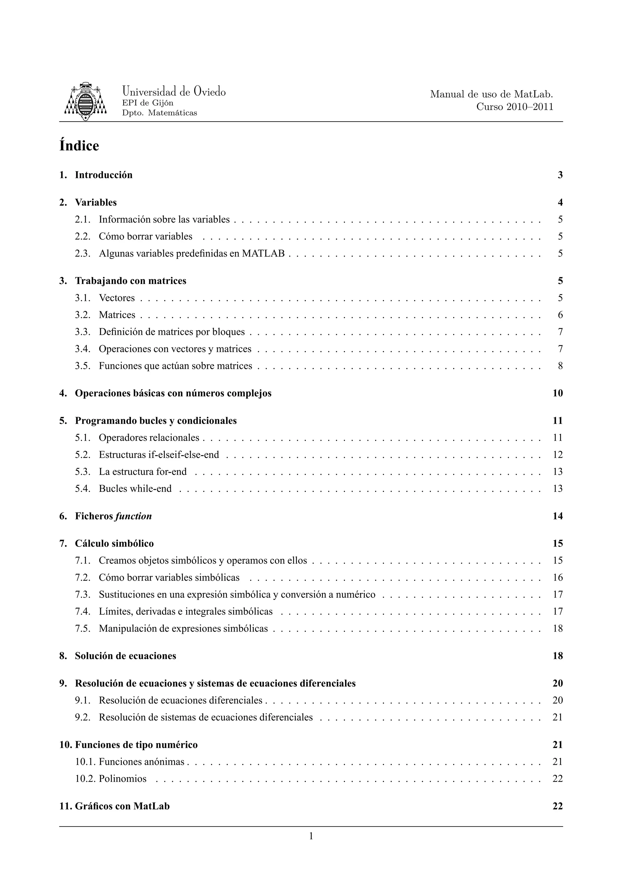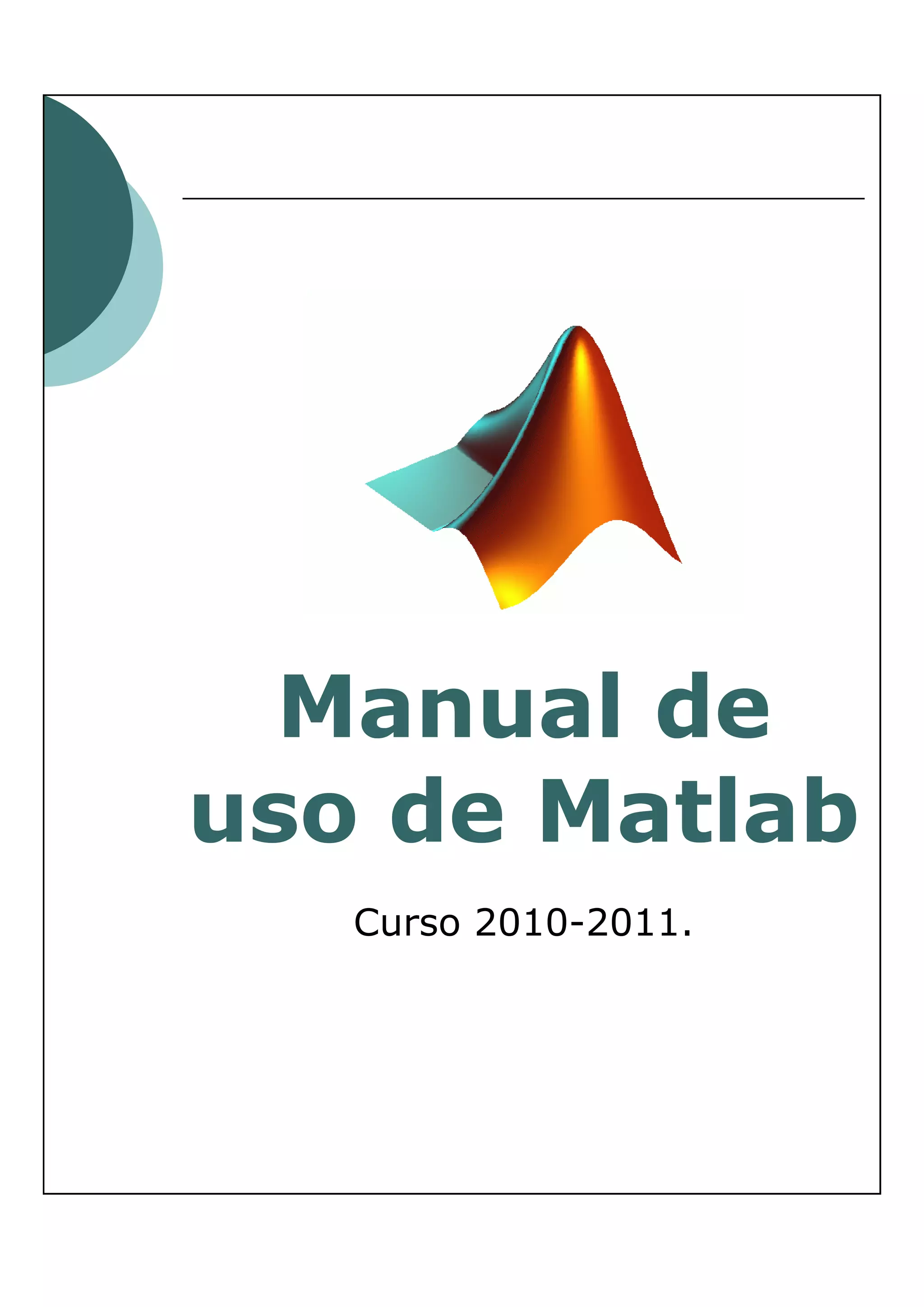 Este documento presenta un manual de uso de MATLAB. Explica conceptos básicos como variables, vectores, matrices, operaciones matemáticas, bucles y condicionales. También cubre cálculo simbólico, gráficos, ecuaciones diferenciales y funciones numéricas. El manual proporciona instrucciones detalladas sobre cómo utilizar estas herramientas en MATLAB.