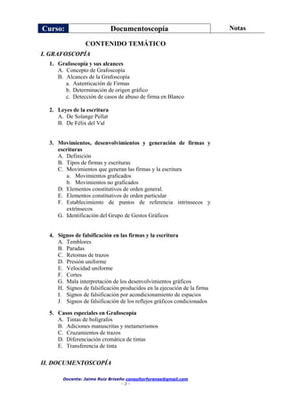 El curso de documentoscopía, dirigido por Jaime Ruiz Briseño, tiene como objetivo capacitar a los participantes en la autenticidad y análisis de documentos cuestionados, enfocándose en grafoscopía y documentoscopía. El contenido incluye principios sobre autenticación de firmas, detección de falsificaciones, tipos y partes de documentos, así como las leyes que rigen la escritura. Se enfatiza la importancia de entender los movimientos y técnicas detrás de la firma y la escritura para proporcionar argumentos técnico-científicos en la resolución de casos documentales.