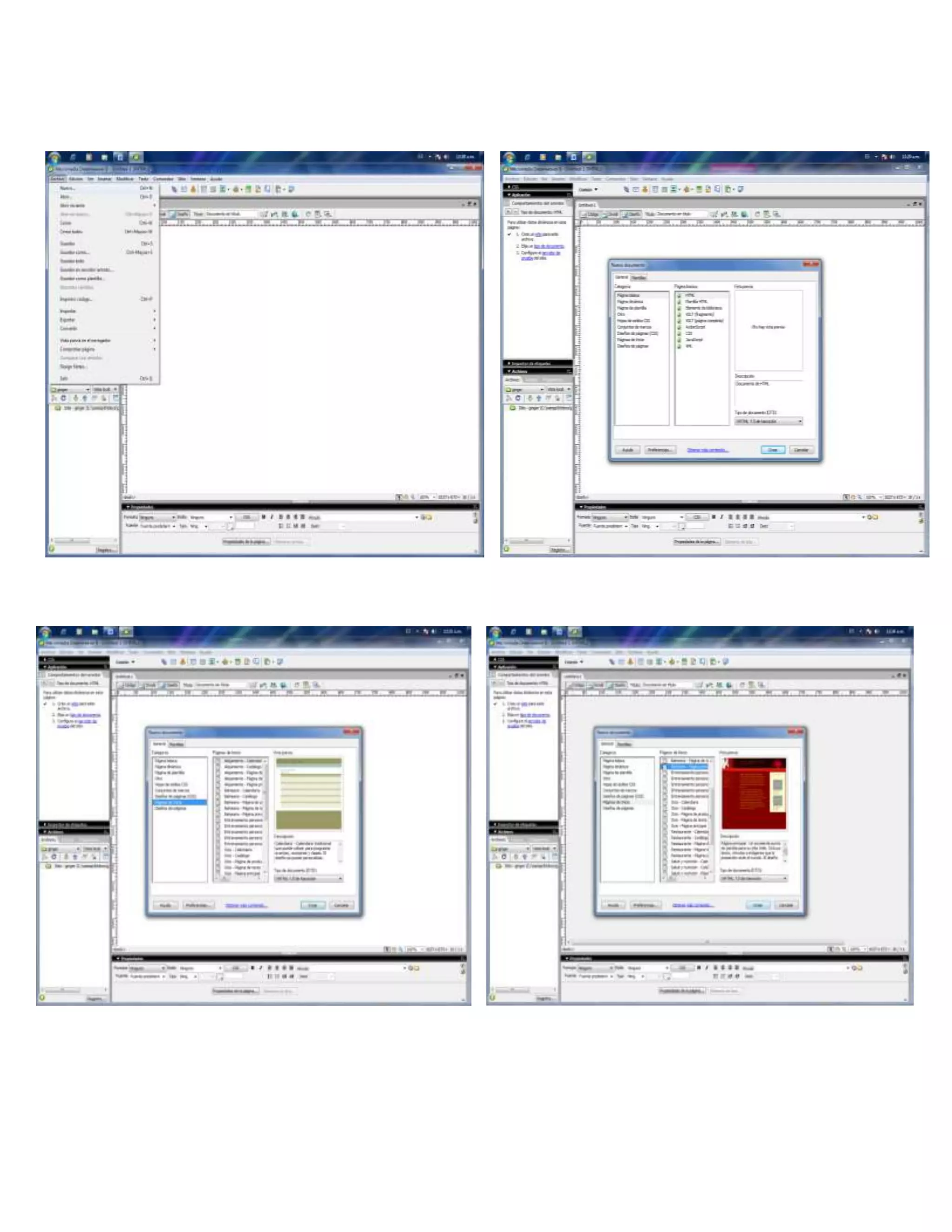 Este documento proporciona instrucciones para crear una plantilla de inicio y una plantilla con tablas en Dreamweaver. También explica cómo crear una base de datos en XAMPP e incluir una página de inicio de sesión, perfil y error. Finalmente, ofrece consejos sobre cómo insertar efectos de JavaScript y crear una hoja de estilos.