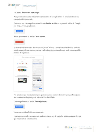 2 Unidad deInnovación Docente Centro de Recursos Digitales Unidad de Innovación Docente Centro de Recursos Digitales 1. Cuenta de usuario en Google Para poder comenzar a utilizar las herramientas de Google Drive es necesario tener una cuenta de Google creada. Para crear una cuenta pulsaremos el botón Iniciar sesión en la pantalla inicial de Google en: http://www.google.com Ahora pulsaremos el botón Crear cuenta Y ahora rellenaremos los datos que nos piden. Nos va a hacer falta introducir el teléfono móvil para confirmar nuestra cuenta, y además podremos usarlo más tarde con una doble política de seguridad. No tenemos que preocuparnos por aportar nuestro número de móvil porque Google no nos va a enviar ningún tipo de información al teléfono. Una vez pulsemos el botón Paso siguiente. La cuenta estará definitivamente creada. Una vez tenemos la cuenta creada podemos hacer uso de todas las aplicaciones de Google que requieren de autenticación.