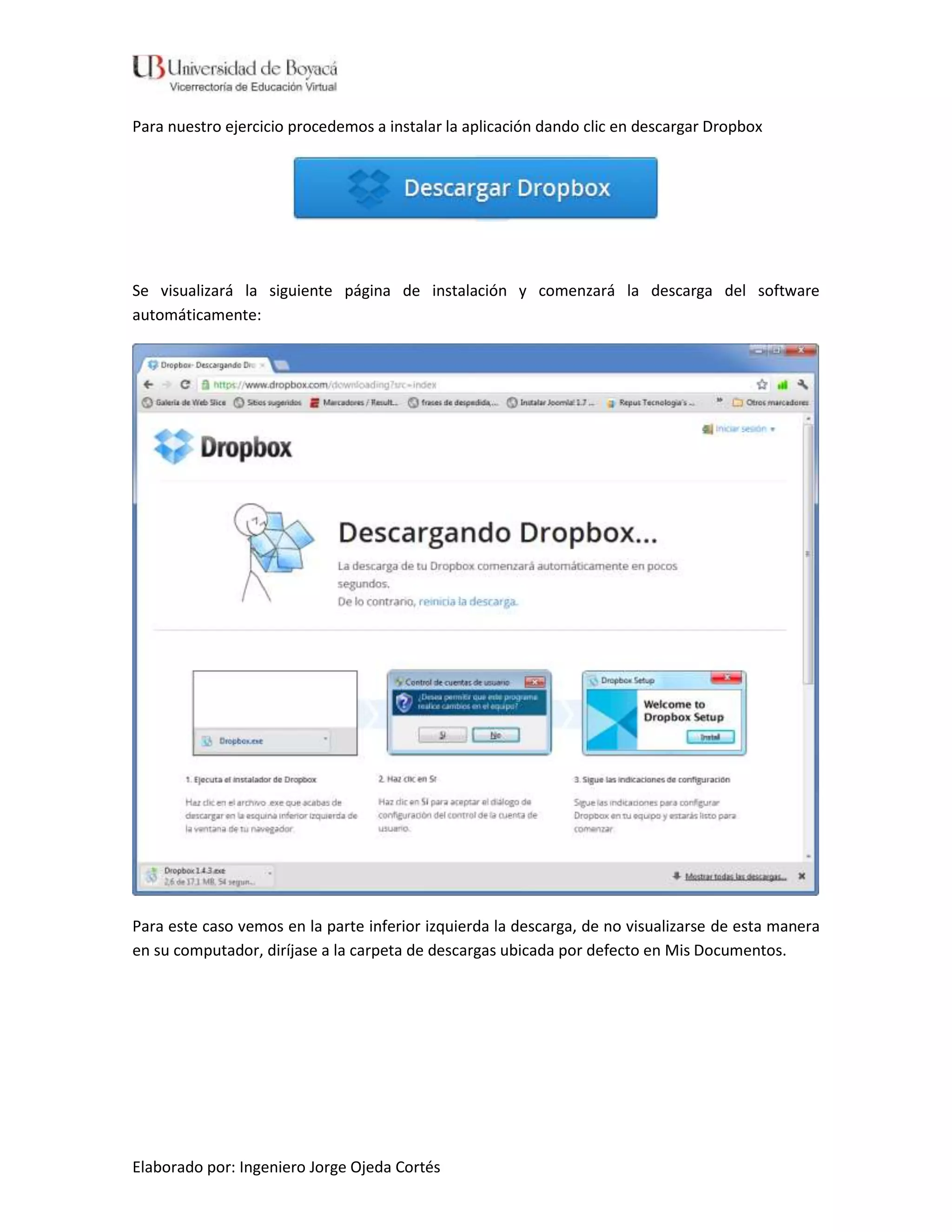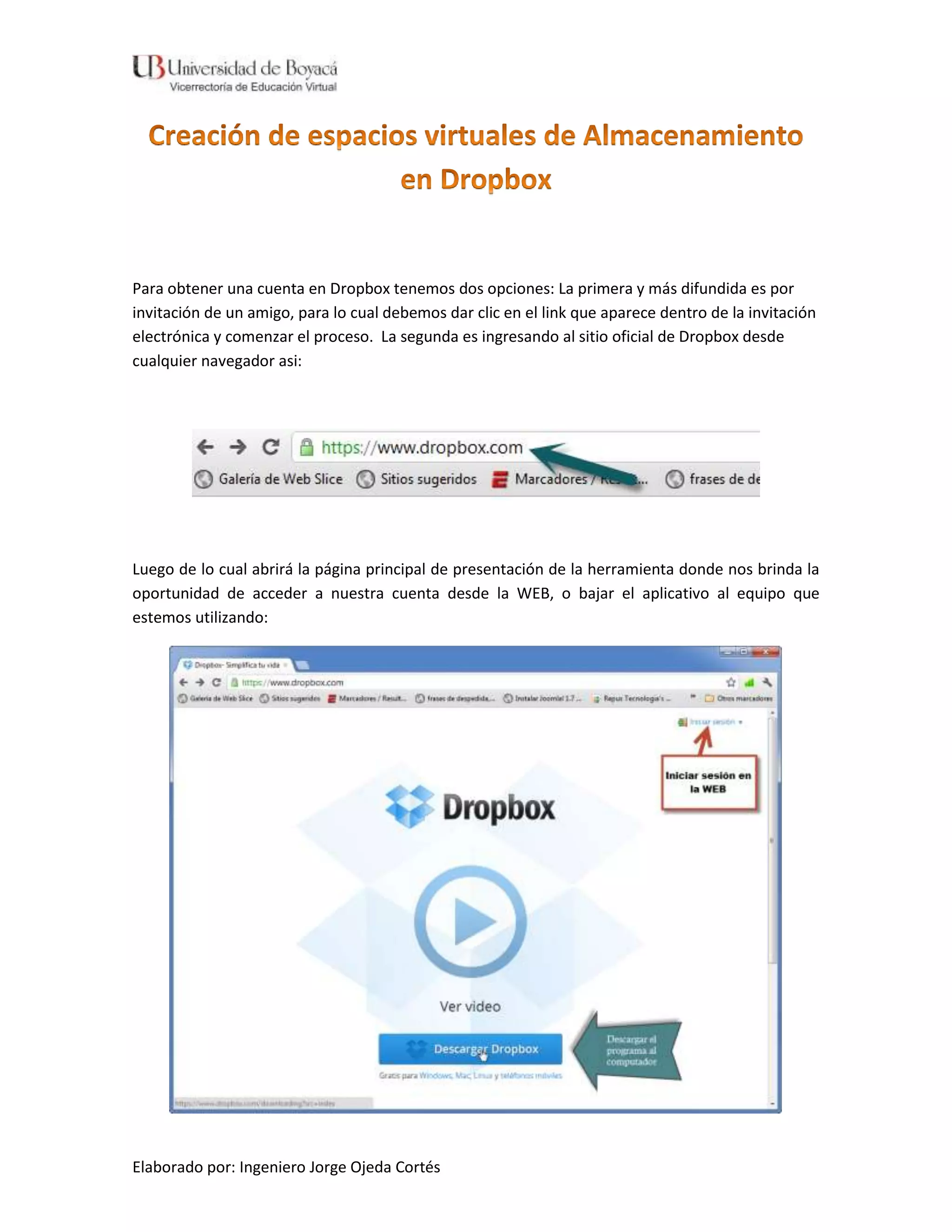 Para obtener una cuenta de Dropbox hay dos opciones: recibir una invitación o registrarse en el sitio web de Dropbox. Una vez registrado, se puede descargar la aplicación e instalarla siguiendo tres pasos sencillos. La aplicación crea una carpeta en el computador para almacenar y sincronizar archivos en la nube de Dropbox.