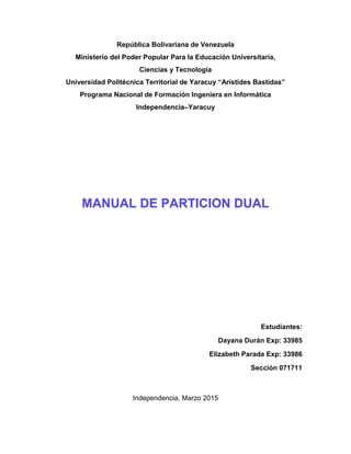 Este documento proporciona instrucciones para instalar dos sistemas operativos, Windows 7 y Ubuntu, en una máquina de manera dual, de modo que el usuario pueda elegir entre uno u otro durante el proceso de arranque. Primero se instala Windows 7 creando dos particiones, luego se instala Ubuntu en la segunda partición, permitiendo al gestor de arranque reconocer ambos sistemas operativos y dar la opción de arrancar cualquiera de los dos.