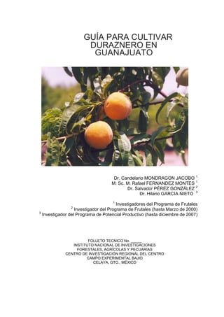 Este documento presenta una guía para cultivar durazneros en Guanajuato, México. Detalla las condiciones ambientales ideales como clima, suelos y agua, así como variedades recomendadas. El estado se divide en cuatro regiones climáticas para el cultivo de durazno. Se describen variedades como 'Regio' y 'San Juan', generadas por el INIFAP, aptas para el Bajío de Guanajuato. La guía provee información sobre propagación, establecimiento, fertilización, riego, control de plagas y cosecha