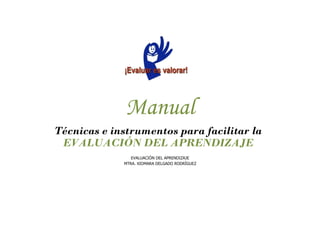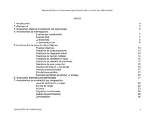 Este manual describe varias técnicas e instrumentos para la evaluación del aprendizaje. Introduce conceptos clave como pruebas, reactivos, técnicas e instrumentos. Explica la evaluación objetiva tradicional y sus técnicas de interrogatorio e instrumentos como exámenes por cuestionario y orales. También cubre técnicas de solución de problemas y sus instrumentos como pruebas objetivas, de ensayo y estandarizadas. Finalmente, presenta técnicas de evaluación alternativa y sus instrumentos de observación como listas de ver