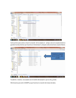 Este documento provee instrucciones paso a paso para crear una base de datos en phpMyAdmin y conectarla a una aplicación creada en Dreamweaver CS6. Explica cómo crear carpetas y bases de datos, activar MySQL y Apache, e insertar registros. También cubre cómo crear formularios para insertar, eliminar y actualizar registros, y cómo generar reportes PDF usando la librería FPDF.