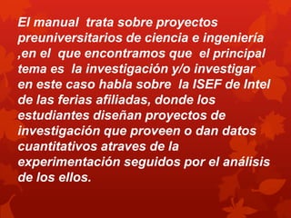 Este manual estudiantil describe proyectos preuniversitarios de ciencia e ingeniería, incluyendo proyectos de investigación, ingeniería, ciencia y matemáticas. Explica cómo los estudiantes diseñan proyectos de investigación que generan datos cuantitativos a través de experimentos y análisis. También cubre técnicas de investigación como la observación, y los derechos de autor que protegen las obras creadas.