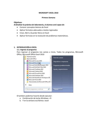 Este documento proporciona una introducción al programa Microsoft Excel 2010. Cubre conceptos básicos como la estructura de la hoja de cálculo, formatos, edición de datos, fórmulas y trabajo con diferentes hojas y libros. Incluye objetivos de aprendizaje y ejemplos prácticos para aplicar los conceptos.