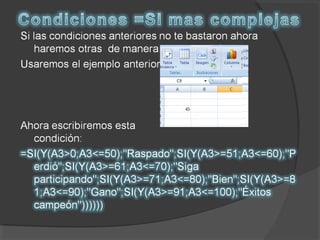 Este documento proporciona instrucciones para buscar datos en una hoja de cálculo usando la función BUSCARV. Explica cómo escribir la fórmula =SI para buscar un valor en un rango de celdas basado en una condición, especificando la hoja, rango, y mensaje de error. También muestra cómo cambiar el valor en una celda para obtener resultados diferentes.