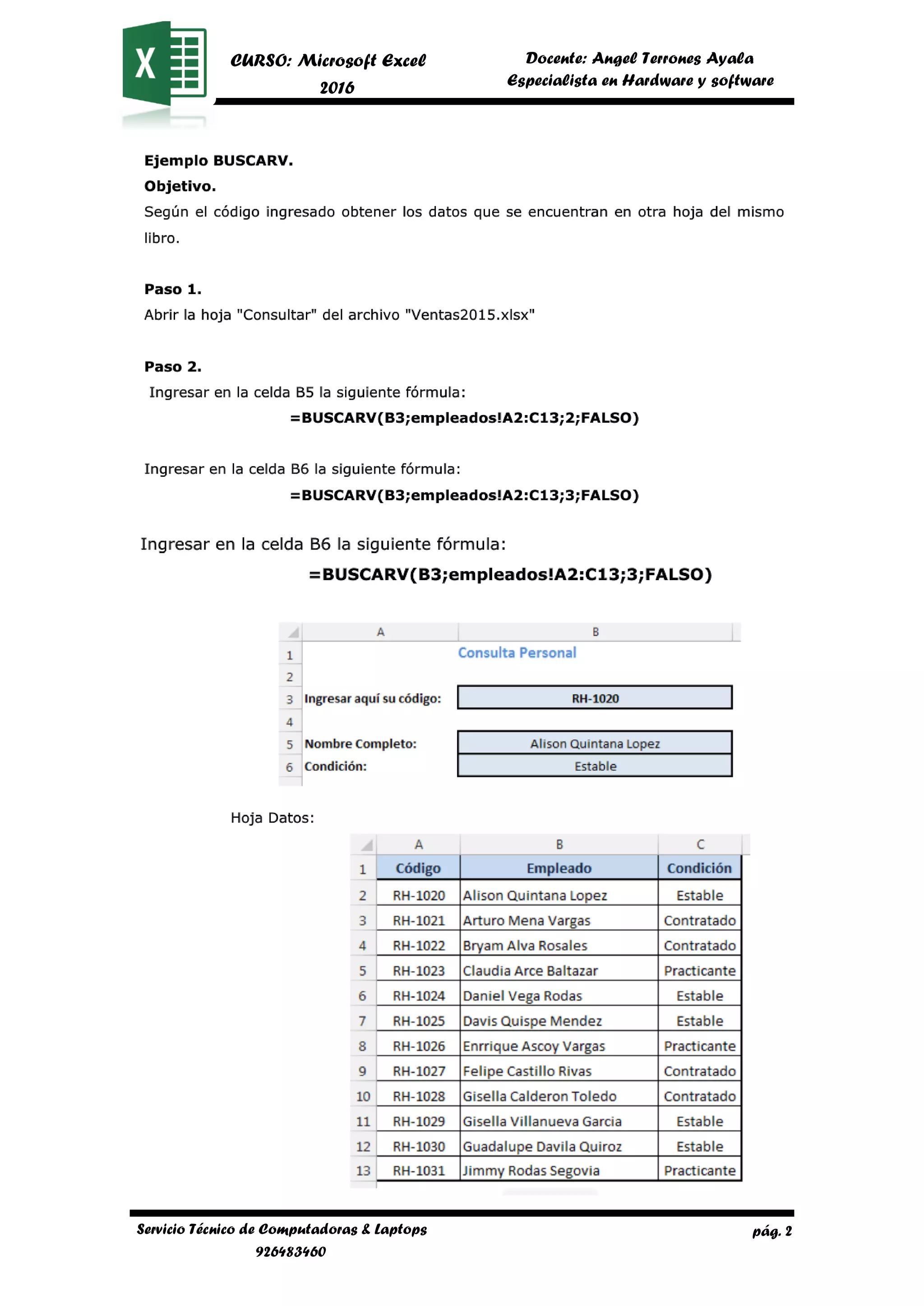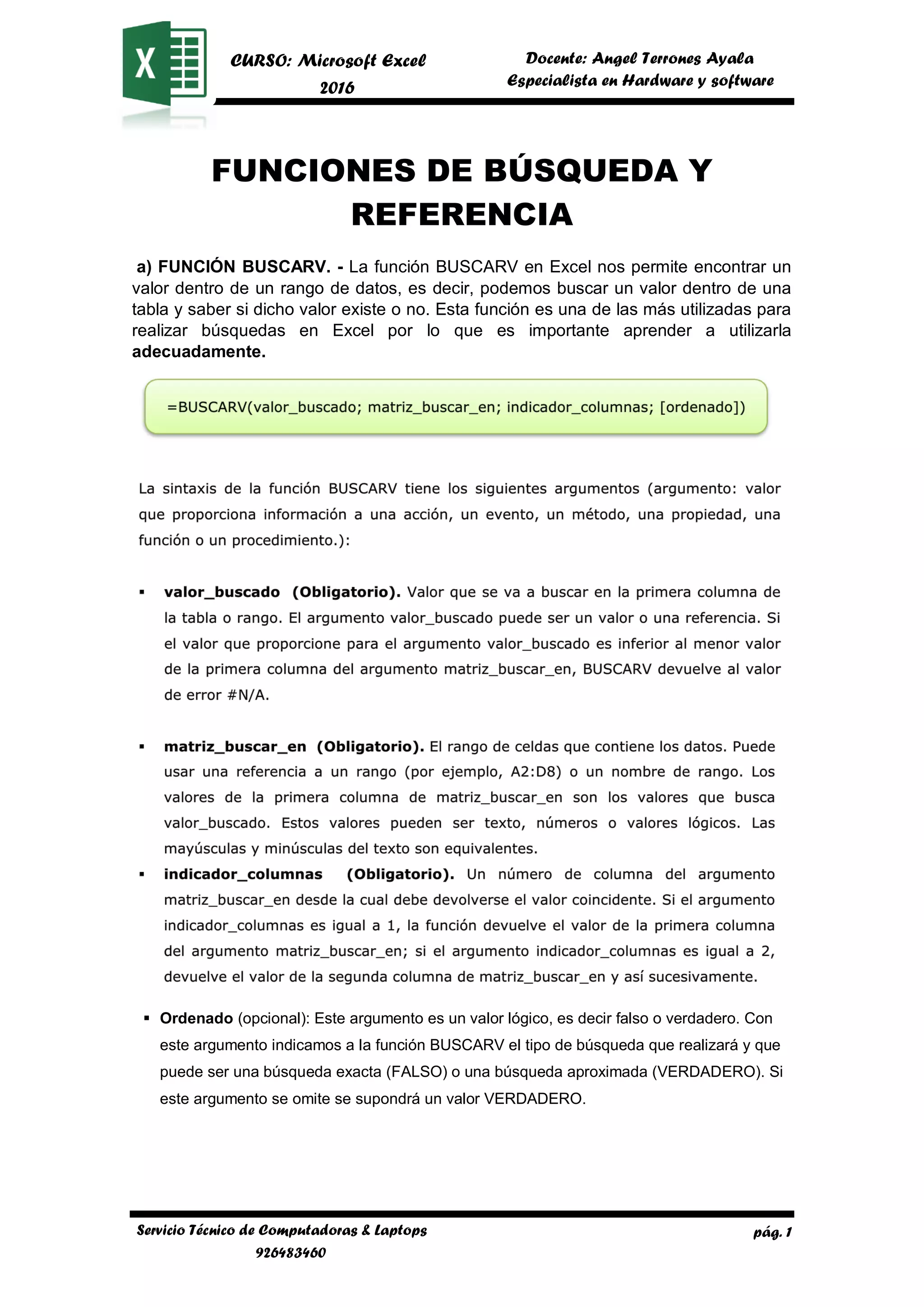 Este documento presenta un curso sobre funciones de búsqueda y referencia en Microsoft Excel 2016, incluyendo las funciones BUSCARV, BUSCARH, Coincidir, Elegir e Índice. Explica que BUSCARV busca un valor dentro de un rango de datos, BUSCARH busca un valor dentro de una fila, y las otras funciones también se usan para buscar y referenciar valores en Excel. El curso es impartido por Angel Terrones Ayala, especialista en hardware y software.