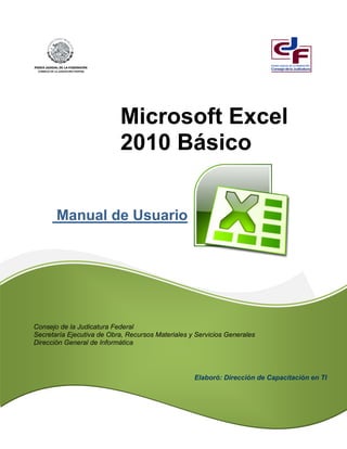 Este documento presenta una introducción básica a Microsoft Excel 2010. Explica los conceptos clave como libros de trabajo, hojas de cálculo, celdas, filas y columnas. Detalla los elementos de la interfaz como la cinta de opciones, barra de acceso rápido y cuadros de diálogo. Además, cubre temas como creación y administración de hojas y libros de trabajo, selección de celdas, uso de fórmulas y funciones, formato y edición. El objetivo es proporcionar una guía para usuarios princip