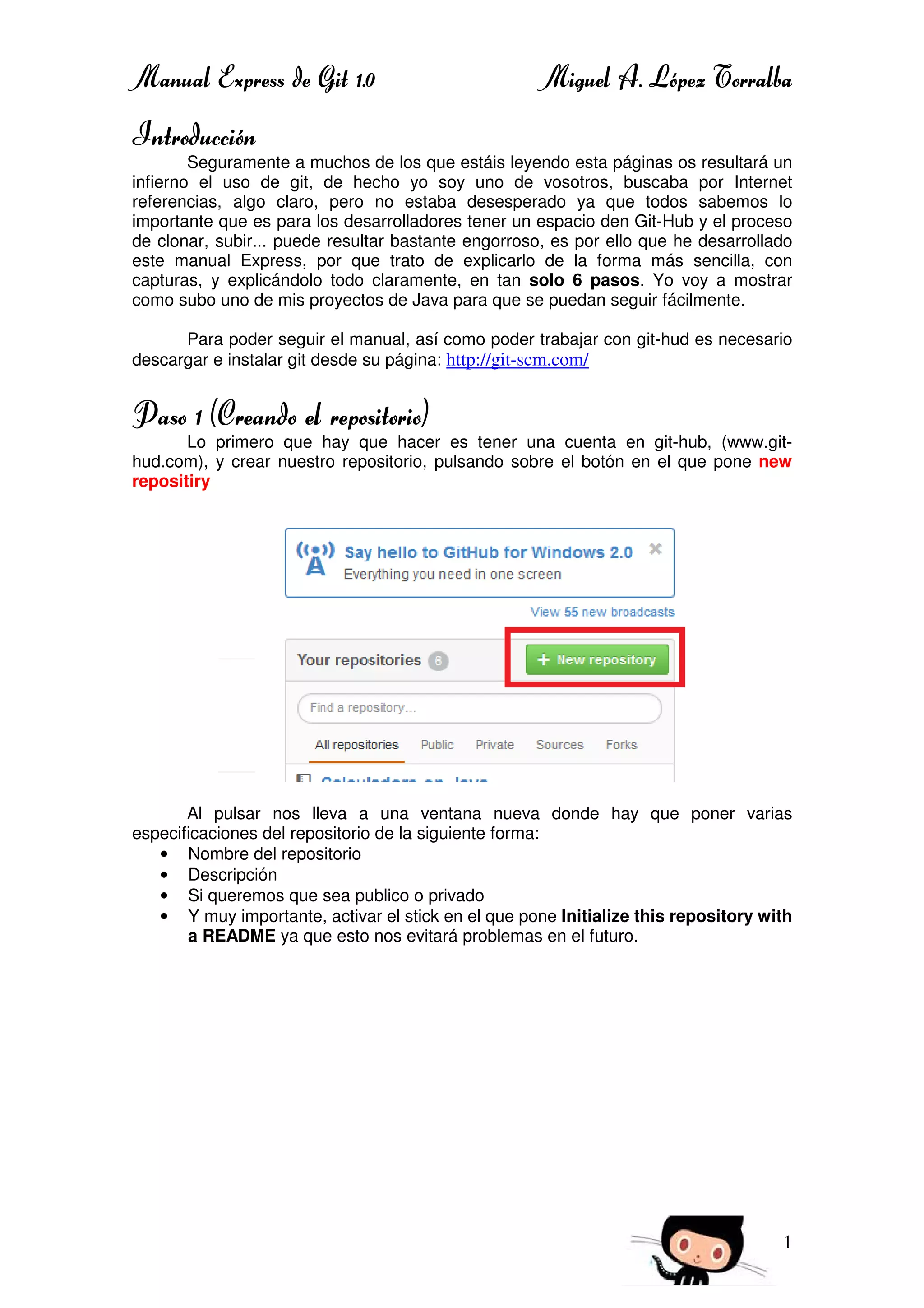 Este manual explica el proceso de 6 pasos para subir un proyecto a GitHub usando Git. Los pasos incluyen: 1) crear un repositorio en GitHub, 2) clonar el repositorio localmente, 3) copiar archivos al directorio clonado, 4) agregar archivos al repositorio local, 5) confirmar los cambios con un mensaje, y 6) subir los cambios al repositorio remoto en GitHub. El objetivo es explicar el proceso de una manera simple y clara con capturas de pantalla.