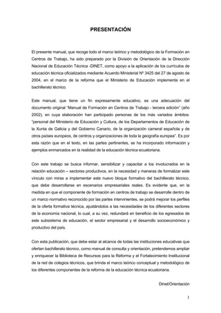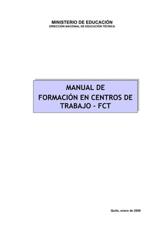 Este manual tiene como objetivo principal proporcionar el marco teórico y metodológico para la implementación del módulo de Formación en Centros de Trabajo (FCT) en el bachillerato técnico ecuatoriano. El manual explica que la FCT busca mejorar la calidad de la educación técnica mediante la aplicación de programas de prácticas en empresas, y fomentar el diálogo entre la educación y el sector productivo. Asimismo, el manual proporciona información sobre los agentes y procesos involucrados en