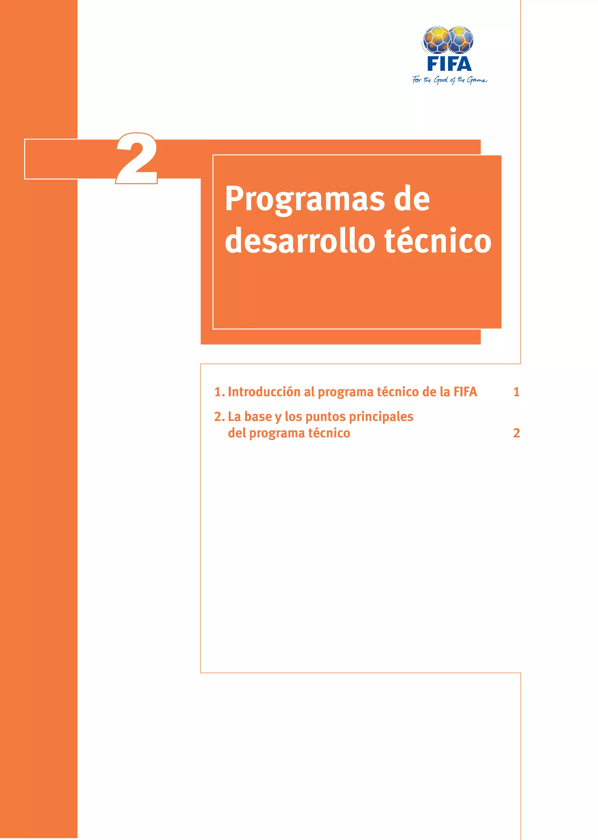 El documento describe dos programas de desarrollo técnico de la FIFA. El primero se enfoca en la formación y capacitación de jóvenes futbolistas a través de entrenamientos individualizados y de equipo. El segundo destaca la importancia de contar con entrenadores capacitados para implementar programas de formación efectivos, por lo que la FIFA ofrece cursos y manuales de dirección técnica.