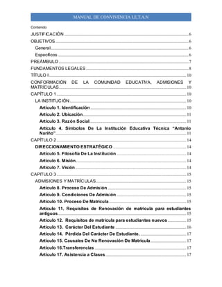 Este manual de convivencia de la Institución Educativa Técnica Antonio Nariño establece los objetivos, fundamentos y disposiciones para regular la convivencia escolar. Define los derechos, deberes y responsabilidades de los estudiantes, docentes y padres de familia. Además, establece los procesos académicos y disciplinarios, así como los organismos de participación de la comunidad educativa. El propósito es contribuir al desarrollo integral de los estudiantes en un ambiente de valores y convivencia armónica.