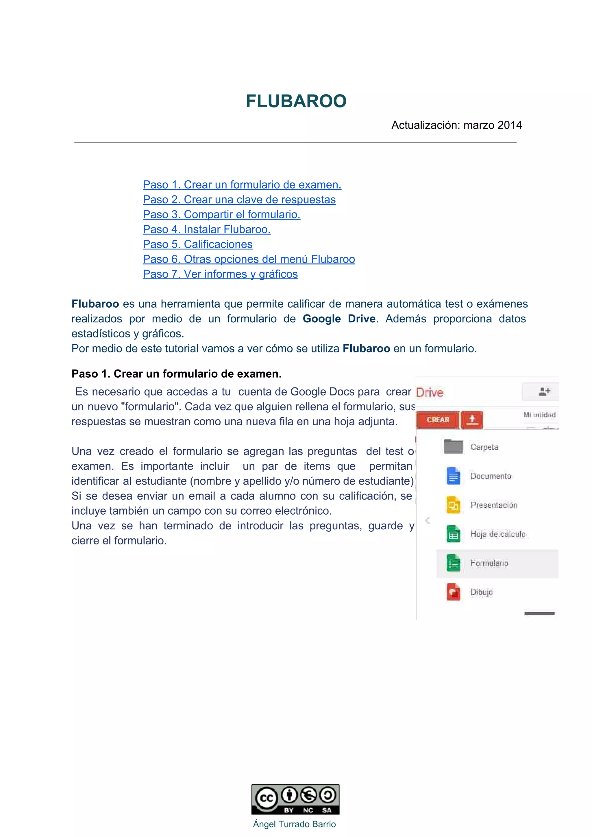 Flubaroo es una herramienta que permite calificar de forma automática exámenes realizados a través de un formulario de Google Drive. El proceso implica 7 pasos: 1) crear un formulario de examen, 2) crear una clave de respuestas, 3) compartir el formulario, 4) instalar Flubaroo, 5) obtener las calificaciones de forma automática, 6) enviar los resultados por correo electrónico y ver informes, y 7) ver gráficos estadísticos. Flubaroo proporciona calificaciones individuales, un resumen