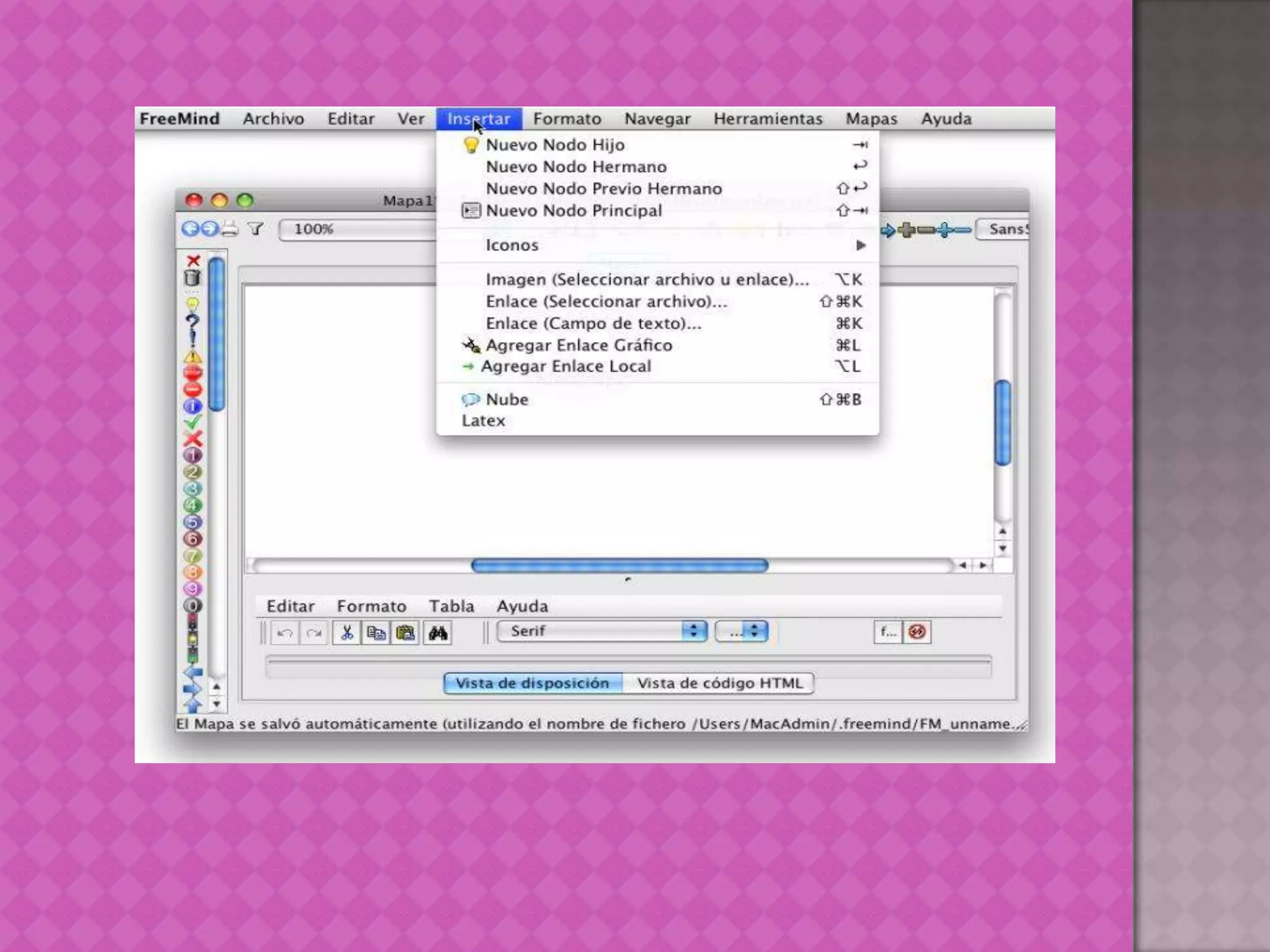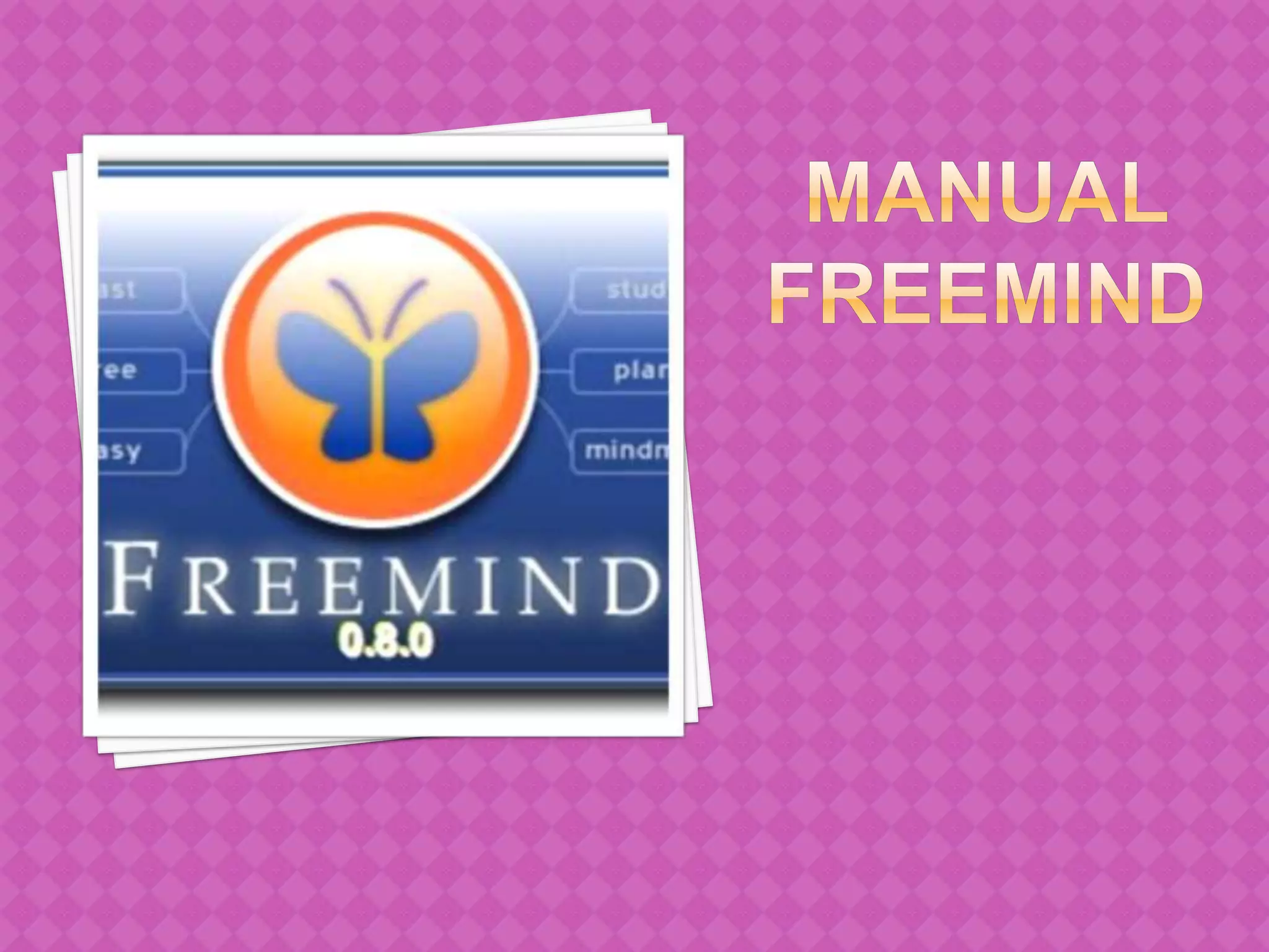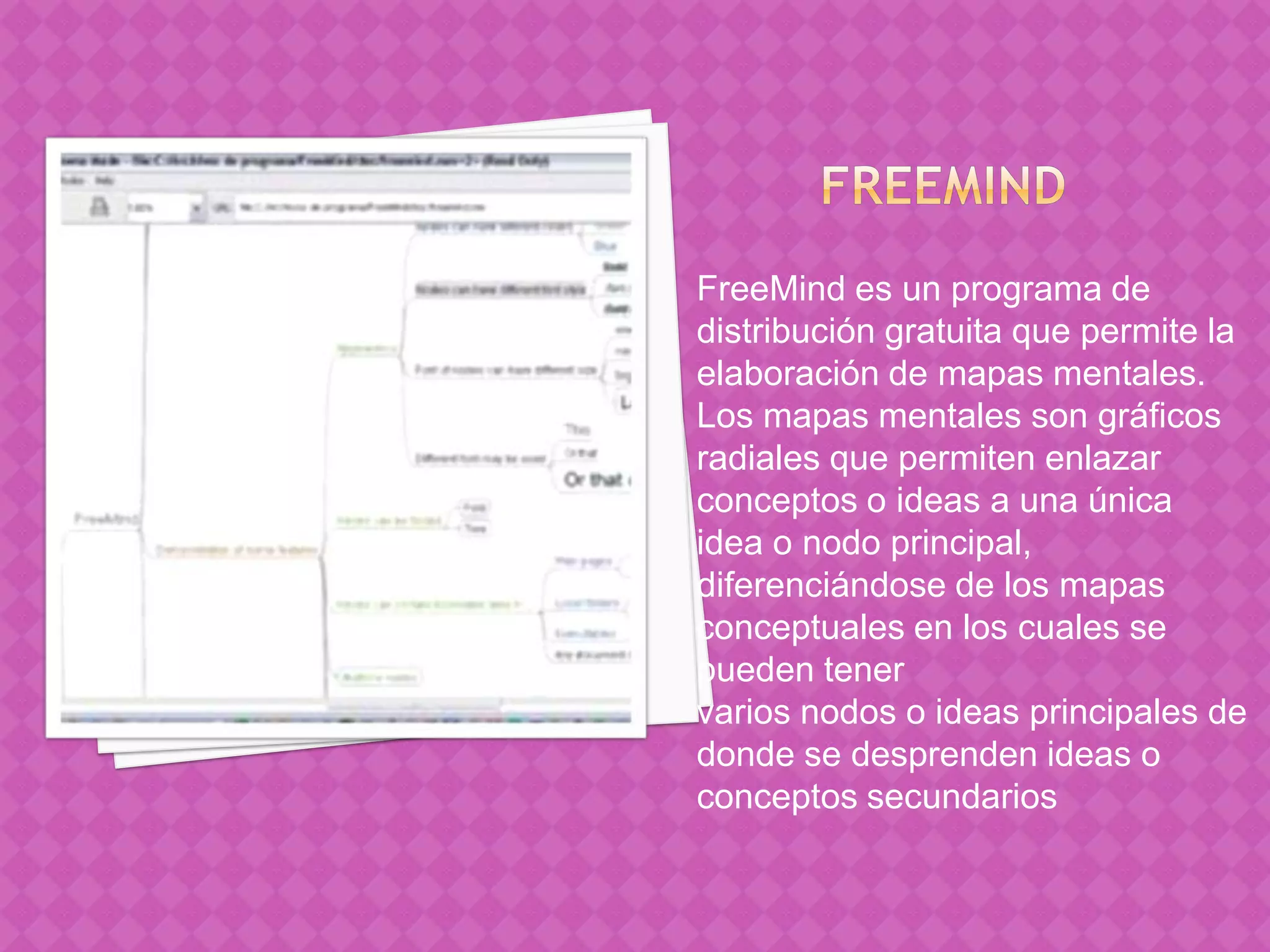 FreeMind es un programa gratuito que permite crear mapas mentales mediante nodos y ramas para vincular conceptos e ideas. Para utilizar FreeMind, se debe abrir el programa y crear un nuevo mapa mental escribiendo el título principal y luego agregar nodos hijos con los conceptos secundarios. El programa permite formatiar los nodos, cambiar fuentes, colores y más para organizar y visualizar las ideas de forma gráfica.