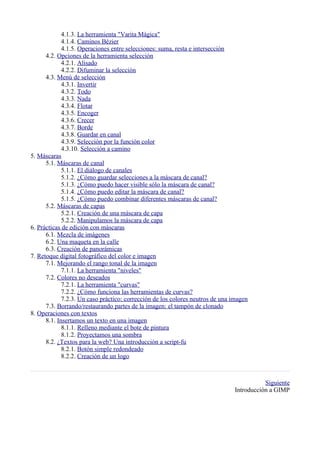 Este documento presenta una guía básica de referencia y aprendizaje sobre el programa GIMP. Explica las ventanas y diálogos principales de GIMP como la caja de herramientas, el área de trabajo de la imagen y el diálogo de capas, canales y caminos. También introduce conceptos como cargar, guardar y crear imágenes, y los formatos de imagen compatibles con GIMP como XCF, PAT, TIFF y JPEG.
