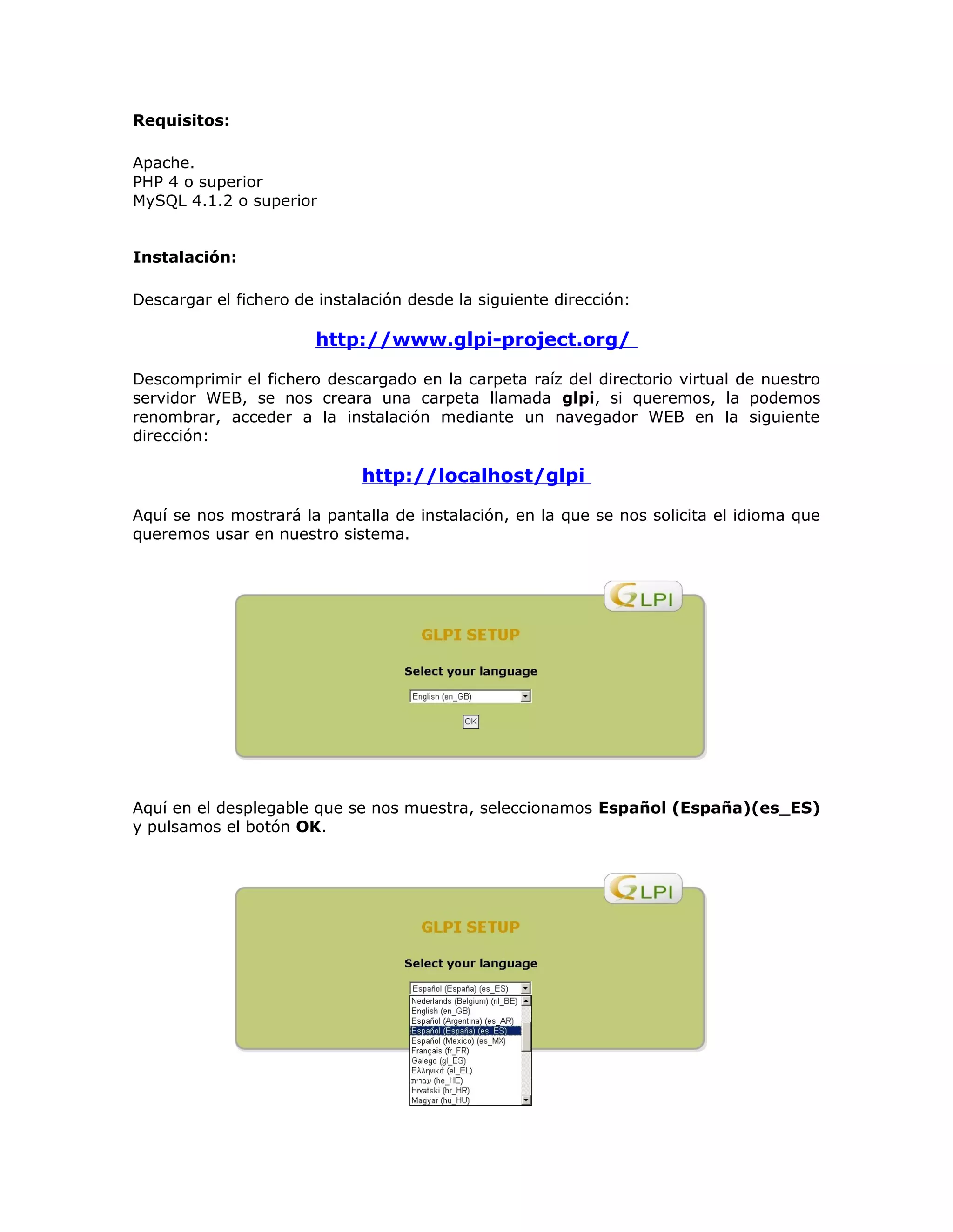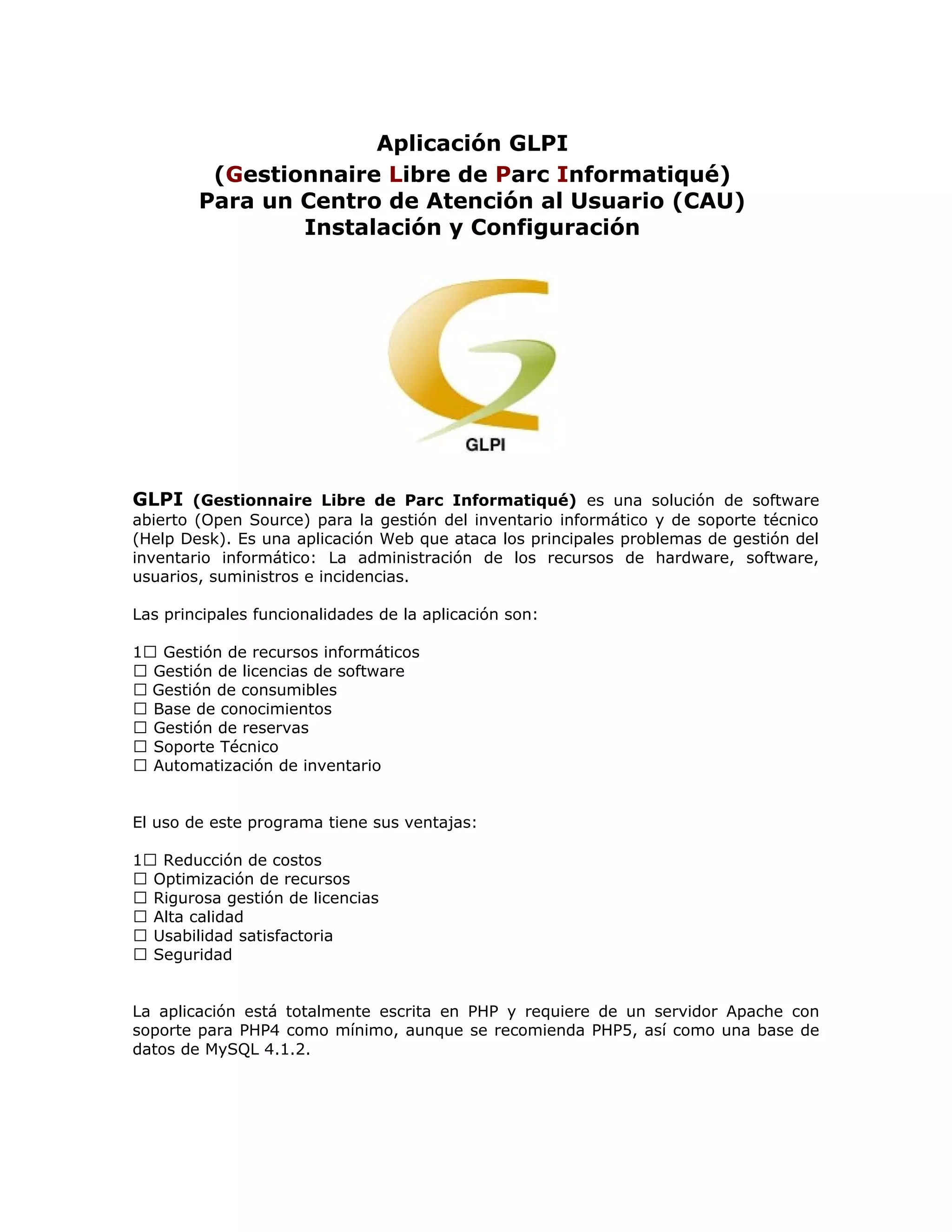 Este documento describe la instalación y configuración de la aplicación GLPI (Gestionnaire Libre de Parc Informatiqué) para un Centro de Atención al Usuario. GLPI es una solución de software libre para la gestión del inventario informático y soporte técnico. Explica los pasos para descargar, instalar y configurar GLPI, incluyendo la creación de usuarios, personalización de la interfaz, y cómo gestionar el inventario de ordenadores, monitores, software, electrónica de red, periféricos, impresoras y cart