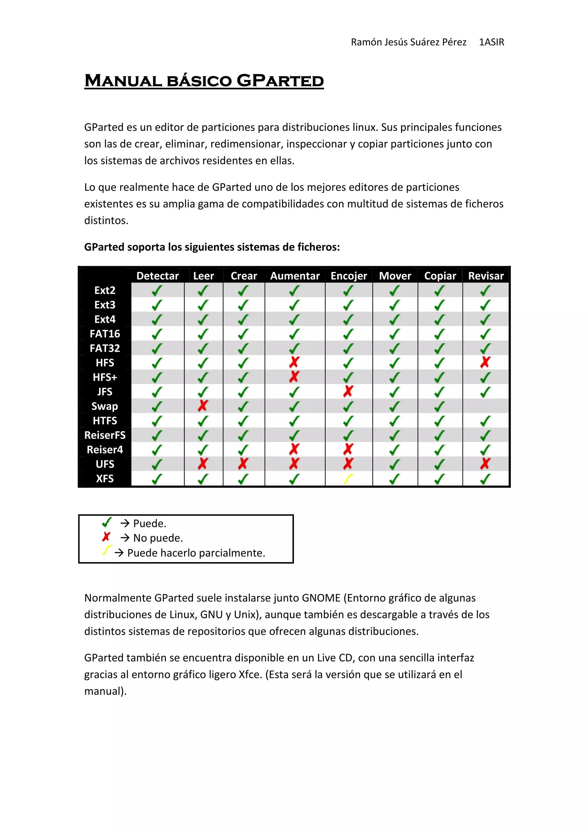 GParted es un editor de particiones para sistemas Linux que permite crear, eliminar, redimensionar e inspeccionar particiones y sistemas de archivos. Soporta múltiples sistemas de archivos y puede instalarse como aplicación independiente o a través de distribuciones Linux. Su interfaz gráfica sencilla facilita la administración de particiones a través de menús y herramientas.