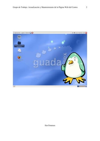 Este documento proporciona instrucciones para instalar y utilizar el programa Hot Potatoes en Guadalinex V3. Explica brevemente qué es Hot Potatoes y sus diferentes herramientas (JCloze, JQuiz, JCross, JMatch y JMix), cómo instalarlo y registrarse, crear carpetas, y cómo usar específicamente la herramienta JCross para crear crucigramas con vocabulario. También incluye enlaces de interés y direcciones de correo electrónico del grupo de trabajo.