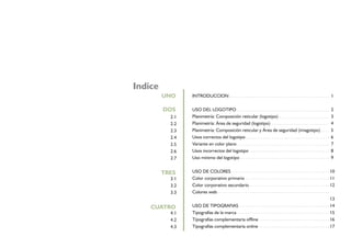 Este documento presenta las directrices para el uso correcto del logotipo y otros elementos de la identidad corporativa de una organización. Explica la planimetría y áreas de seguridad del logotipo, sus usos correctos e incorrectos, y proporciona detalles sobre el uso de colores corporativos y tipografías. El objetivo es asegurar la aplicación coherente de la imagen de marca en todos los materiales y canales de comunicación de la organización.