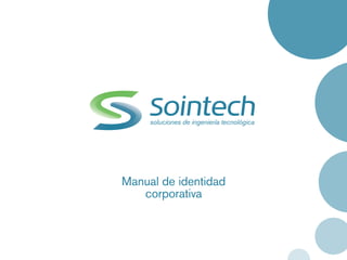 El manual de identidad corporativa describe el diseño de la marca de una empresa, incluyendo el símbolo, logotipo, tipografías, colores, aplicaciones y normas de uso. El símbolo representa el encuentro de dos fuerzas abstractas que forman una S. El logotipo usa una tipografía tecnológica. La paleta primaria contiene azul y verde y la secundaria naranja, cian y gris. El manual establece pautas para el uso correcto de la marca corporativa.
