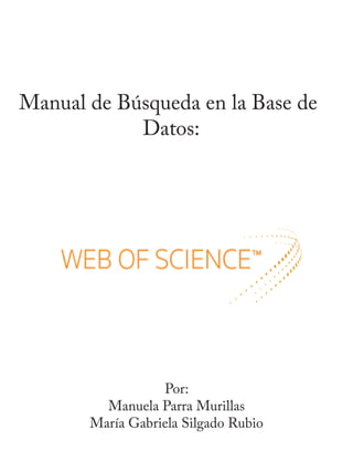 Este manual proporciona una guía de 12 pasos para realizar búsquedas en la base de datos Web of Science, incluyendo cómo acceder a la base de datos a través de la página de la Universidad Javeriana, crear ecuaciones de búsqueda utilizando operadores booleanos, filtrar los resultados y seleccionar documentos relevantes. El objetivo es ayudar a docentes y estudiantes a encontrar información útil de manera efectiva.