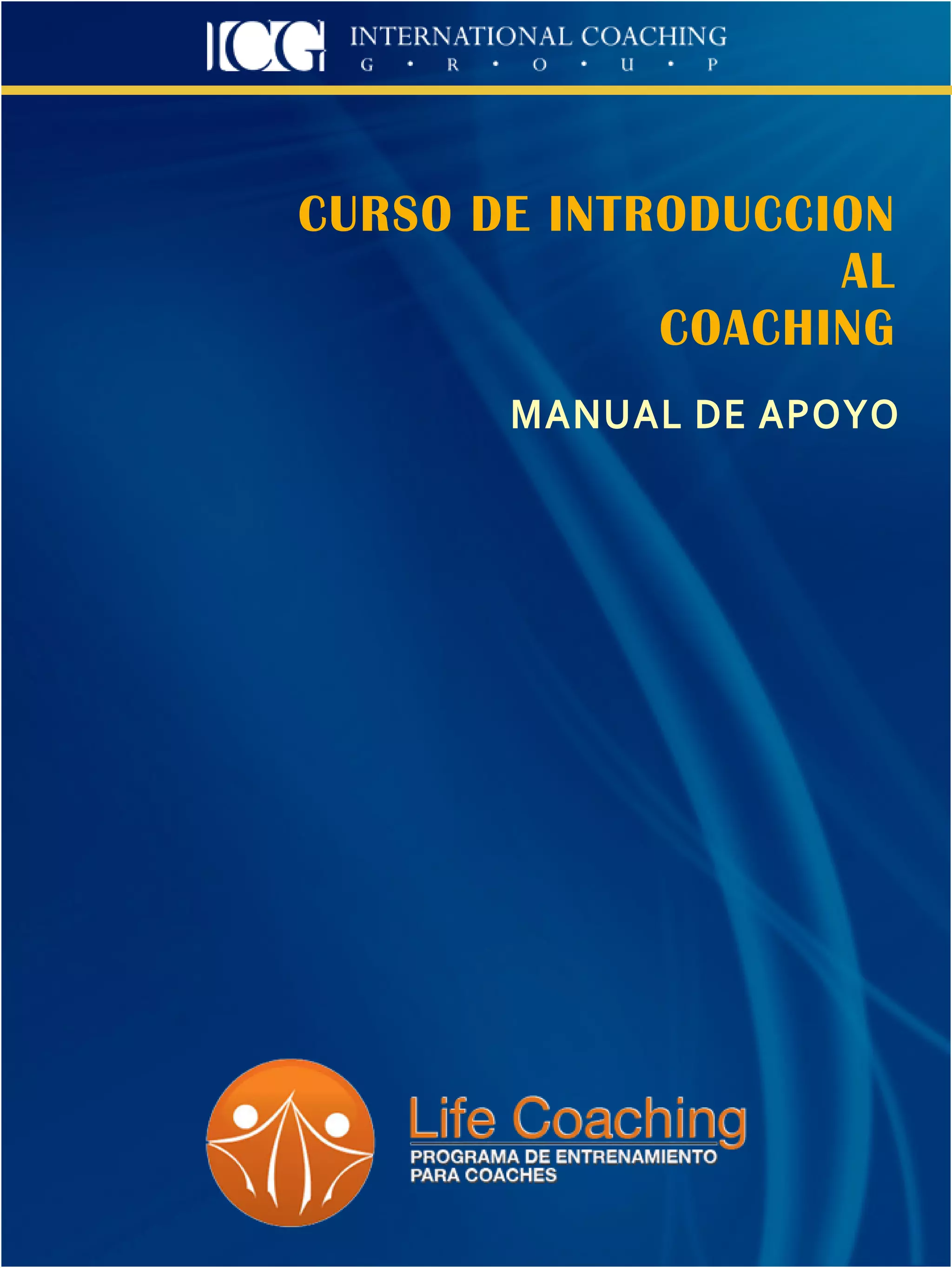 Este documento presenta un manual de apoyo para un curso de introducción al coaching. Explica brevemente qué es el coaching y cómo funciona el proceso de coaching para ayudar a los clientes a lograr sus metas y cerrar la brecha entre su situación actual y lo que desean lograr. También describe algunos principios básicos del coaching como enfocarse en el futuro en lugar del pasado y centrarse en lo que se desea obtener. Finalmente, resume algunas habilidades clave para sesiones de coaching efectivas como escuchar activamente y hacer preguntas para facilitar el