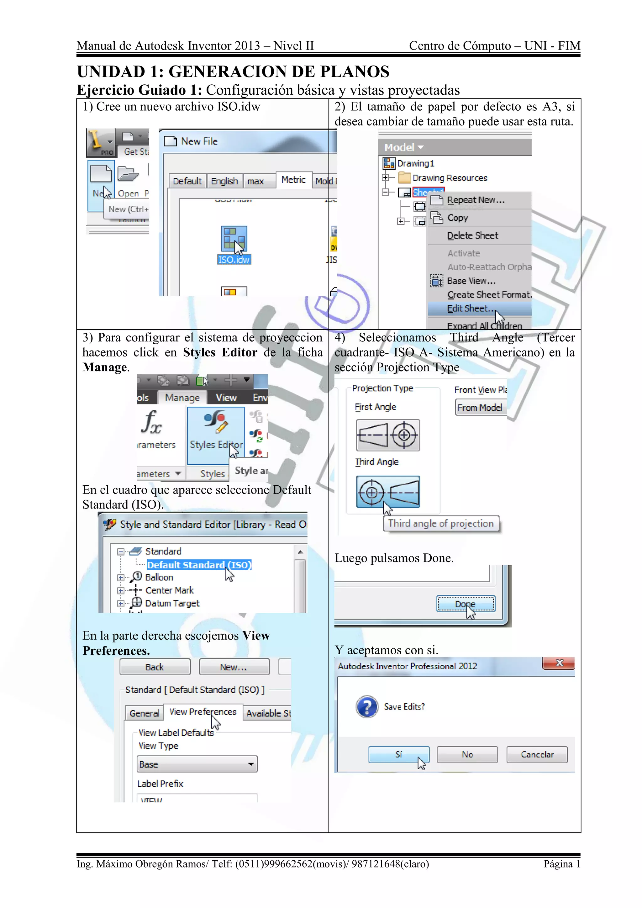 Este manual proporciona instrucciones paso a paso para utilizar Autodesk Inventor 2013 para crear vistas de ensamblajes, incluidas vistas proyectadas, cortes y presentaciones. Muestra cómo configurar el sistema de proyección, generar vistas adicionales, agregar dimensiones y etiquetas, y mover componentes para crear vistas de presentación animadas. El documento también cubre cómo editar movimientos y trayectorias existentes para mejorar las presentaciones.