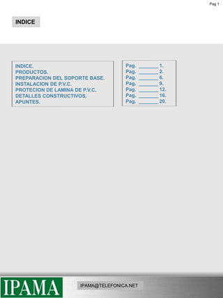 Este manual describe los procedimientos para la instalación de láminas de PVC para impermeabilización de cubiertas. Explica los productos necesarios como fieltro geotextil, láminas de PVC, aislamiento térmico y perfiles. Detalla los pasos de preparación del soporte, instalación de la lámina de PVC, protección de la lámina y detalles constructivos para diferentes tipos de cubiertas como ajardinadas, transitables o de parking.