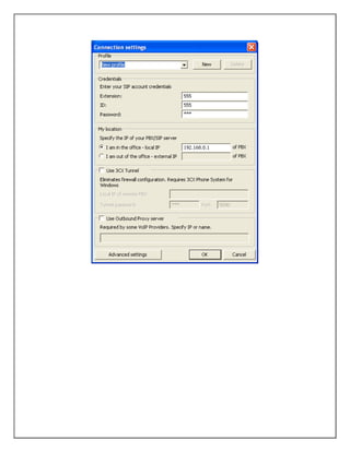 Este documento proporciona instrucciones para configurar un sistema IPX300W desactivando el proxy, ingresando la dirección IP local del dispositivo en un navegador, creando extensiones y configurando teléfonos IP, softphones y un servicio inalámbrico para usar un teléfono móvil.