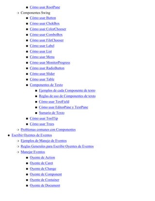 Este documento proporciona una introducción a Swing y sus componentes. Explica qué es Swing y cómo se relaciona con JFC, las versiones que contienen el API Swing, y los paquetes Swing más comunes. También describe brevemente las diferencias entre los componentes Swing y AWT. Finalmente, incluye ejemplos de código de una aplicación Swing sencilla para ilustrar sus características.