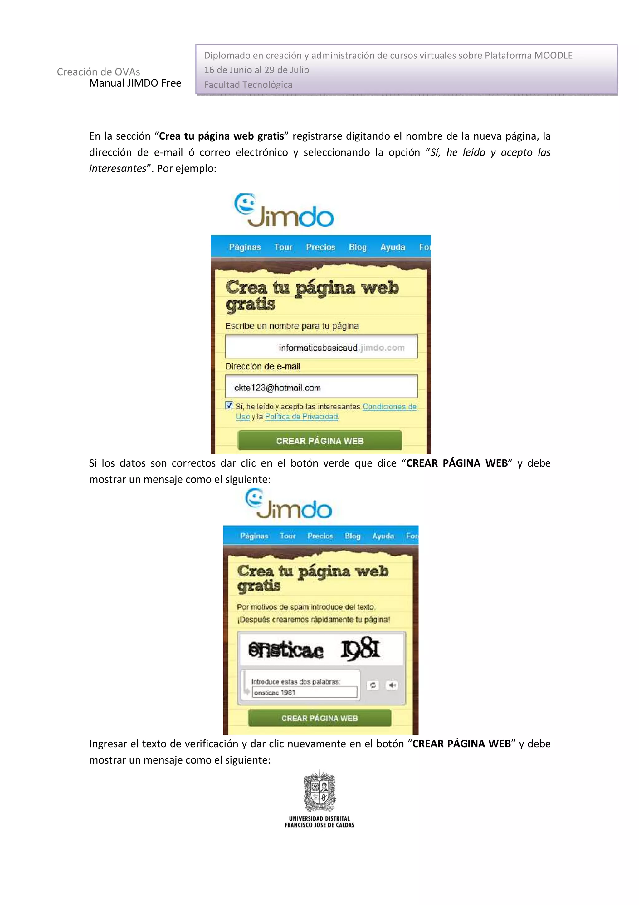 Este documento presenta un manual para crear páginas web gratuitas usando la plataforma Jimdo. Explica cómo registrarse en Jimdo, seleccionar una plantilla, editar elementos como texto e imágenes, y enlazar la página creada en Jimdo a un curso en Moodle para que los estudiantes puedan acceder al contenido desde allí.